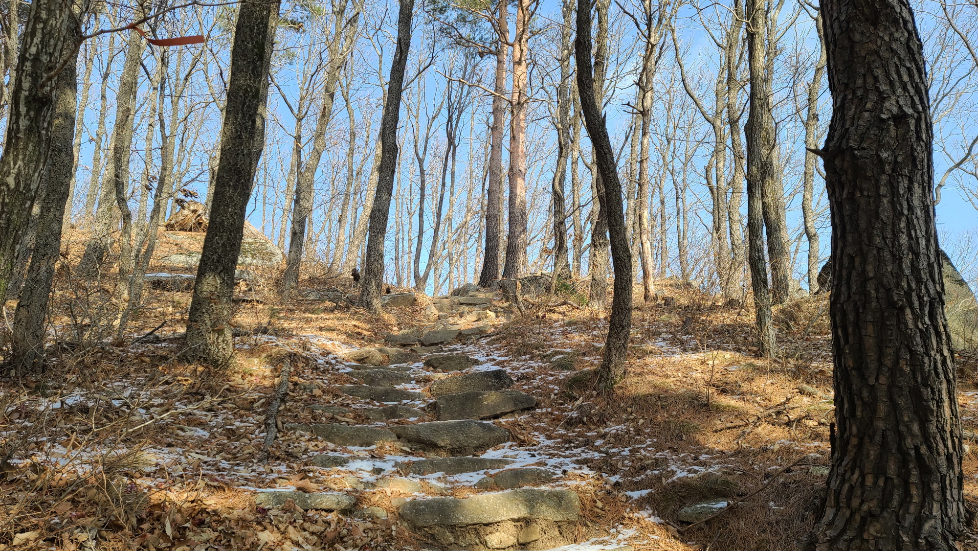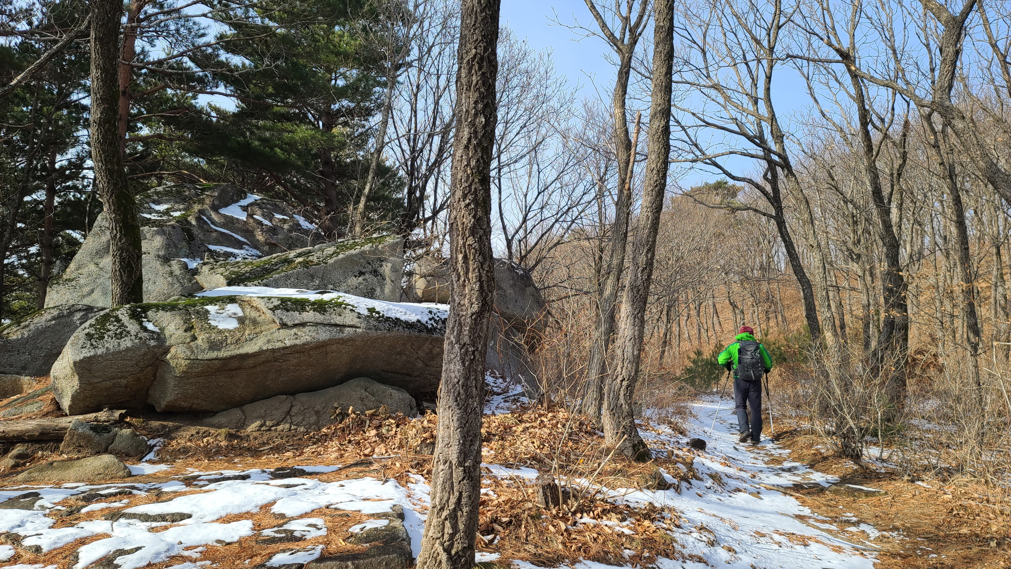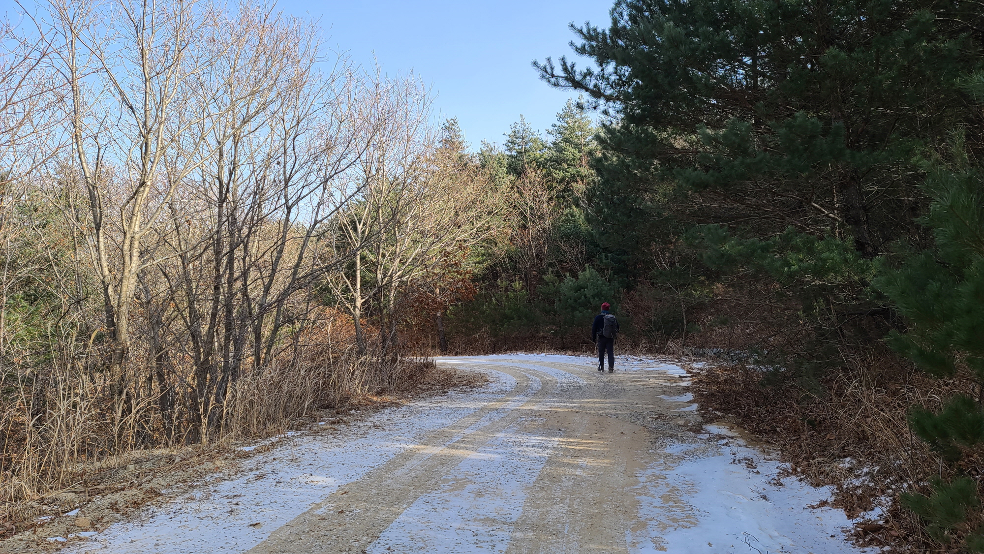 - 우린 명주군왕릉에 차를 세우고, 마을버스를 타고 보현사종점까지 갔다. 그곳에서 마을길을 따라 3~4km 보현사를 향해 걸어가면 아리바우길 입구가 보인다. 그곳부터 술잔바위까지는 오르막이고, 다음부터는 평탄한 내리막 숲길. 감시초소 다음부터는 임로를 따라 내려온다.