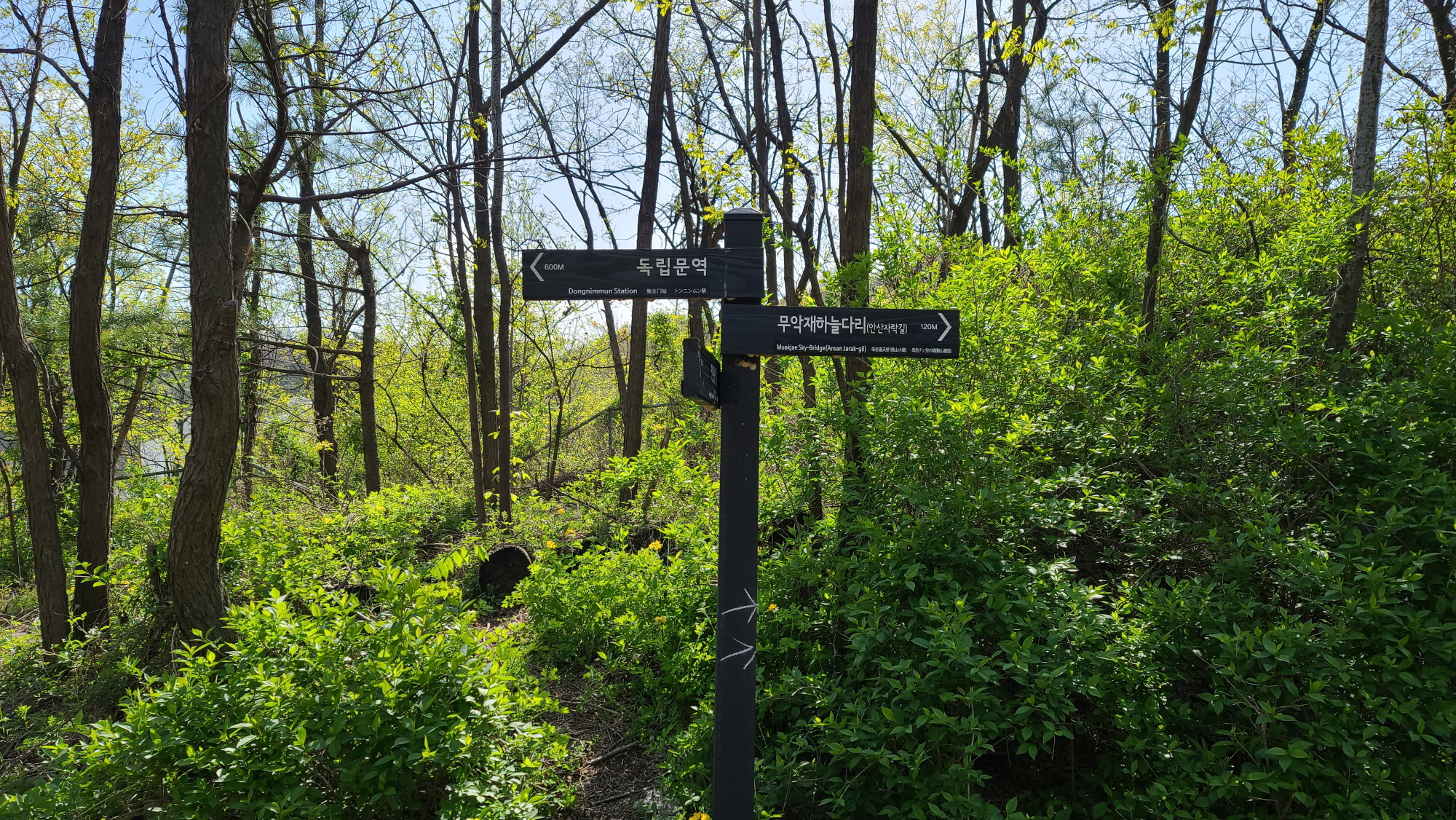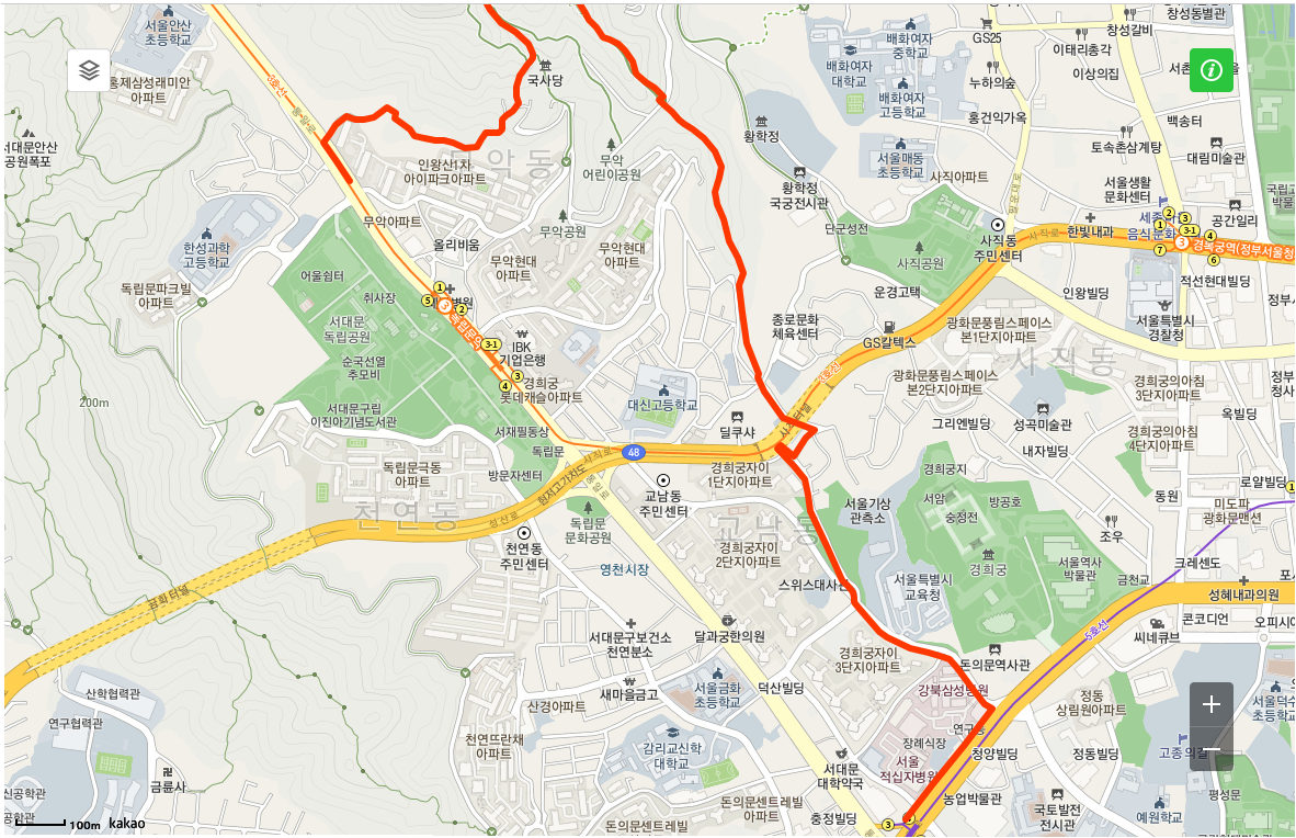 - 서대문역,-> 돈의문터-경고장 - 홍난파 가옥-달큐샤-한양도성안길 전망대-해골바위- 선바위- 인왕산 국사당- 독립문역