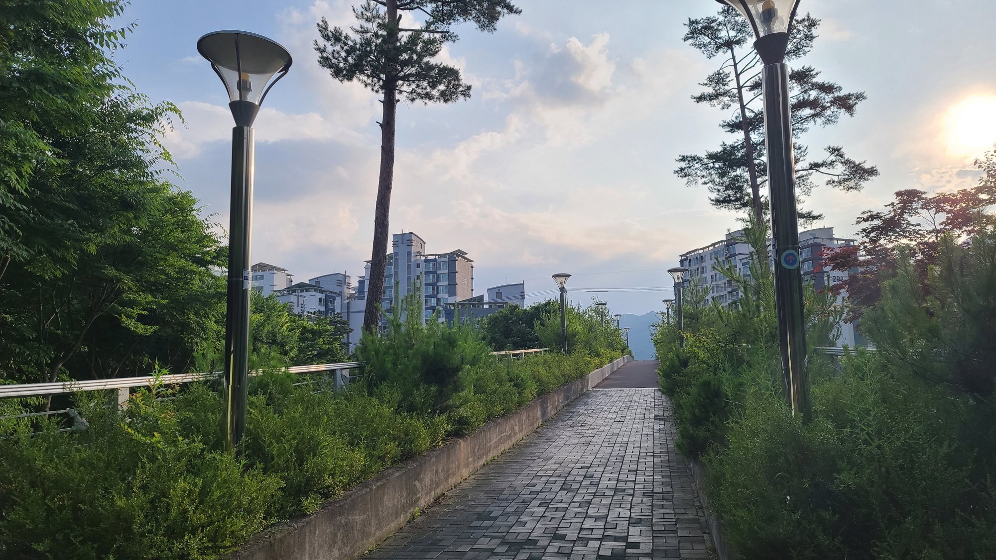 산에서 내려와 짧은 도로를 걷는다.