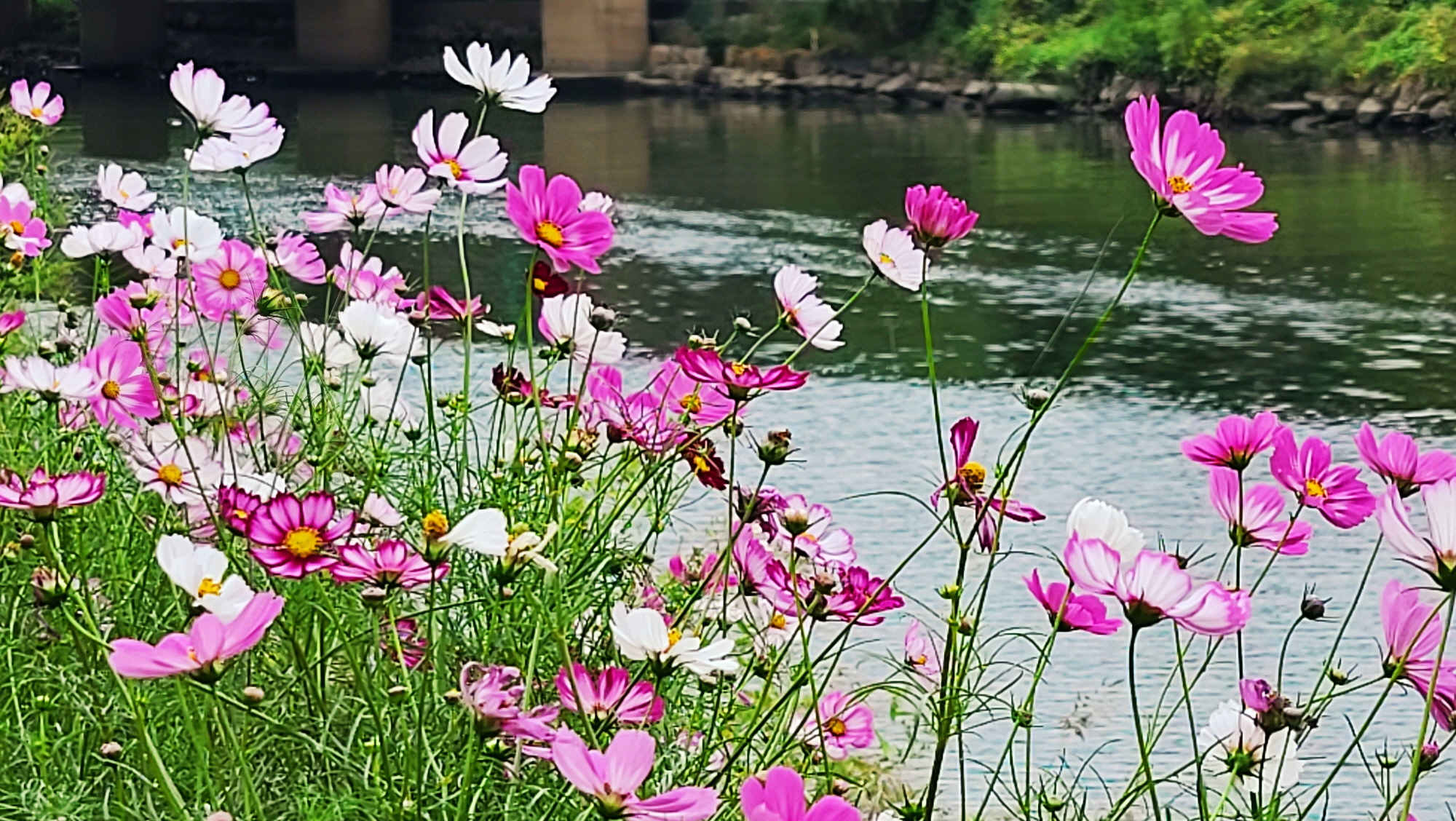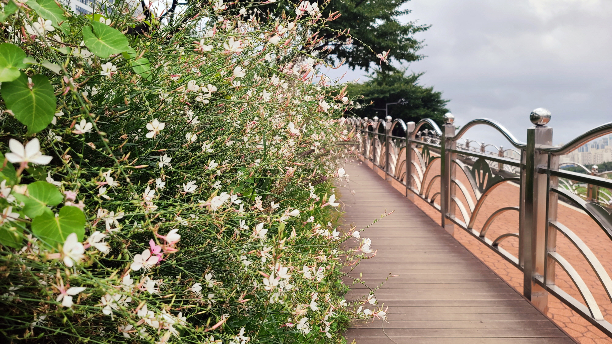 안양천가의 녹음이 우거진 산책길은 아주 아름답다. 안양천 가의 공원으로 내려섰다 올가갔다. 하는 점만 빼면. 산책로가 잘 만들어져 있고, 공원의 봄부터 가을까지 꽃들이 만발한 아름다움 풍경을 즐길 수 있다.
