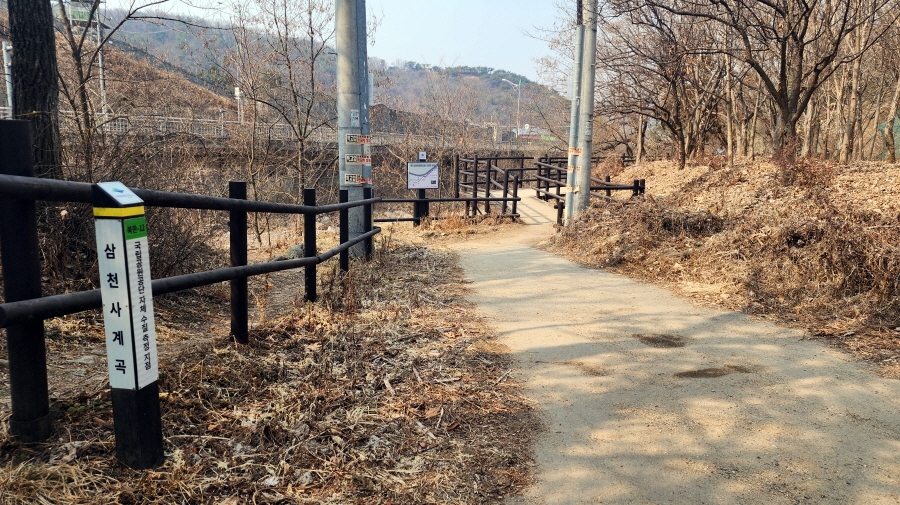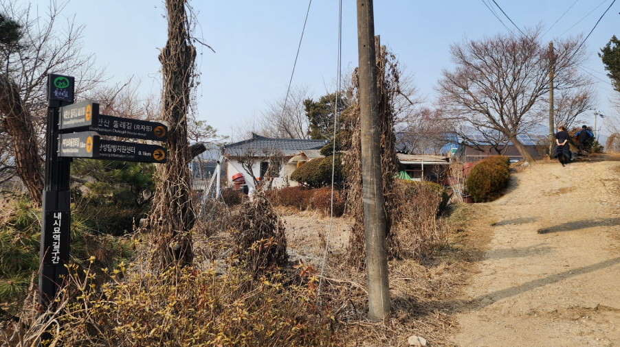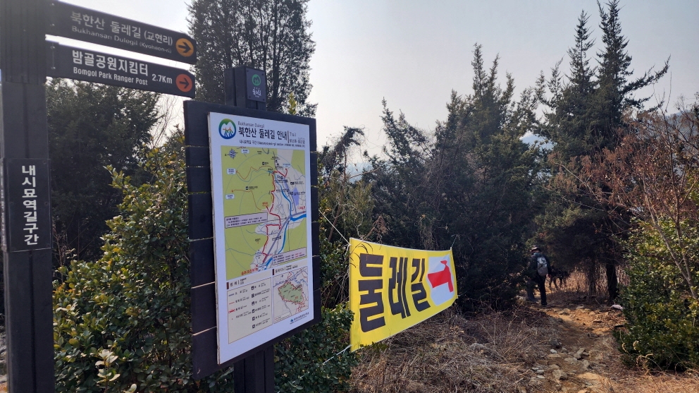 - 한옥마을 입구는 은평둘레길과 겹쳐서 오른쪽 사진처럼 길을 건너 은평둘레길로 가는 사람들이 많다.