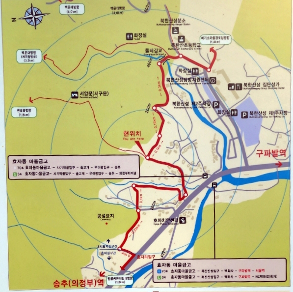 - 북한산 등산로 입구들이 이 코스에 여러개 놓여 있다. 그래서 사람들이 가장 많이 왕래한다.