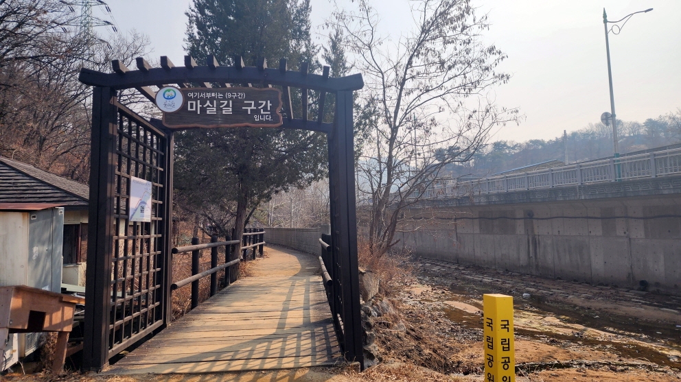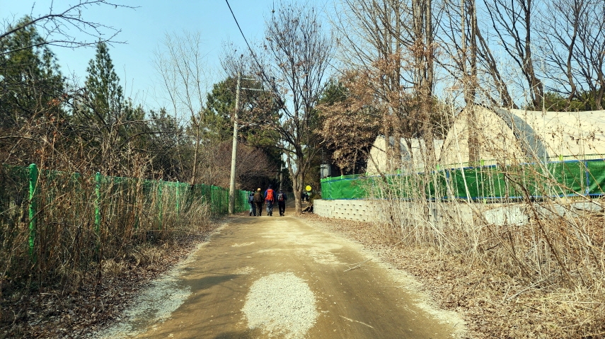 - 북한산둘레길 원래 길은 다리를 건너 도로를 따라 걸어야 하나. 이렇게 직진하면 농원들, 음식점, 카페 등이 있는 사이길로 갈 수 있다. ( 정식길이 아니고 마을에서 내준 길이므로 조용히 걷는 것이 필요하다.)