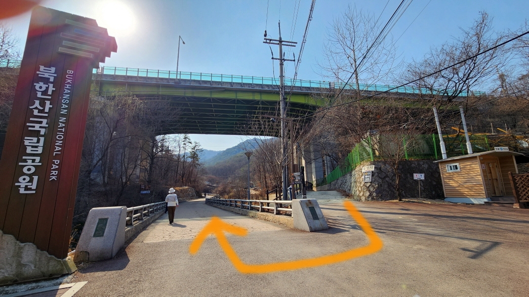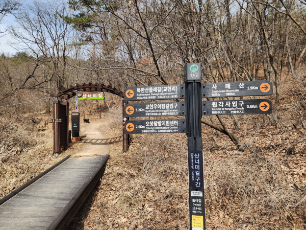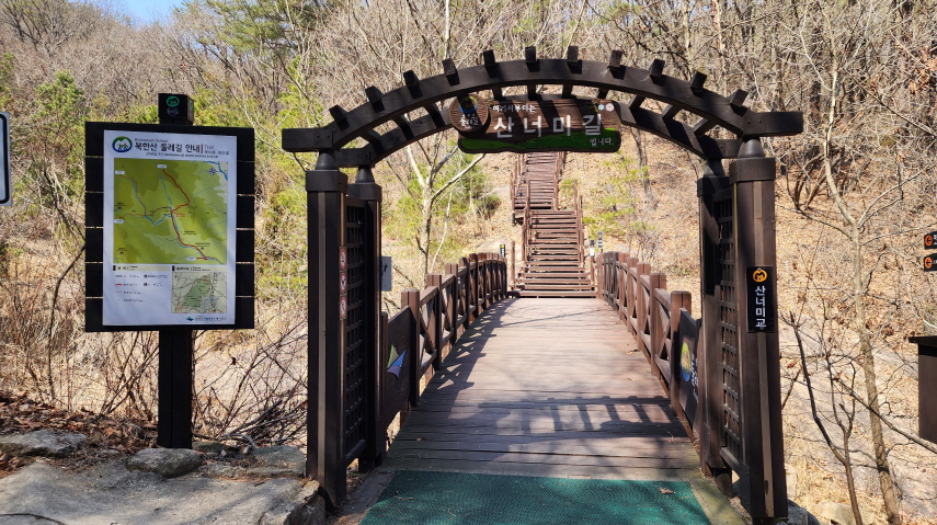 - 북한산 국립공원 기둥과 안내지도가 나오고 길을 따라 조금 더 올라사면 왼쪽으로 산너미길 입구가 있다.