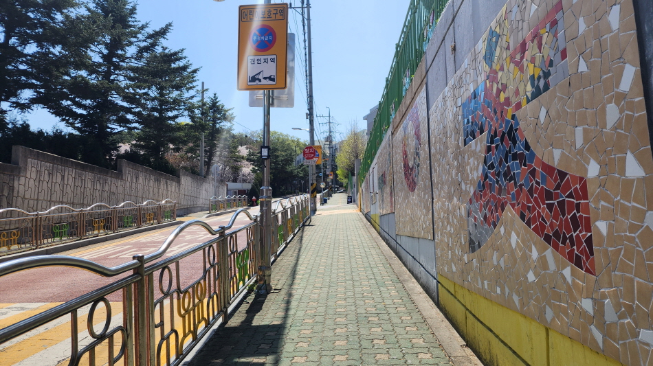 - (2번 사진) 큰길에서 육교를 건너 초등학교 담장을 따라 올라간다.