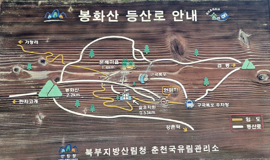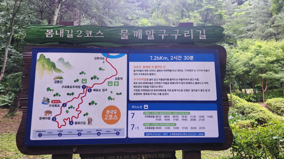 - 2코스: 구곡폭포주차장 -> 구곡폭포 -> 문배마을 -> 봉화산임로 -> 구곡폭포주차장