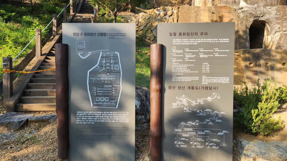 자생화공원에 있는 광산은 일제 강점기 때 수탈의 현장인 광산 구축물이 옛성곽처럼 아직도 산기슭에 남아 있다.