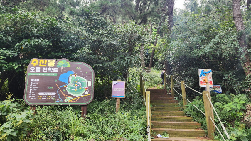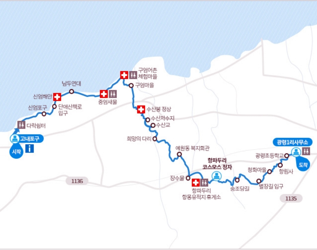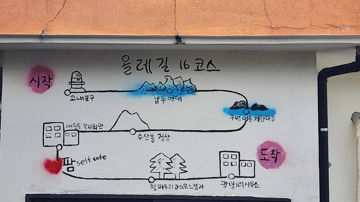 - 고내포구 -2.8km -남두연대 - 구엄어촌체험마을 (4.8km) - 수산봉 정상 (6.6 km) -> 애원동 복지회관 (7.1km) -> 항파코스모스 정자 (11.7km / 중간 스탬프 지점) -> 광영1리 사무소 (15.8km)
