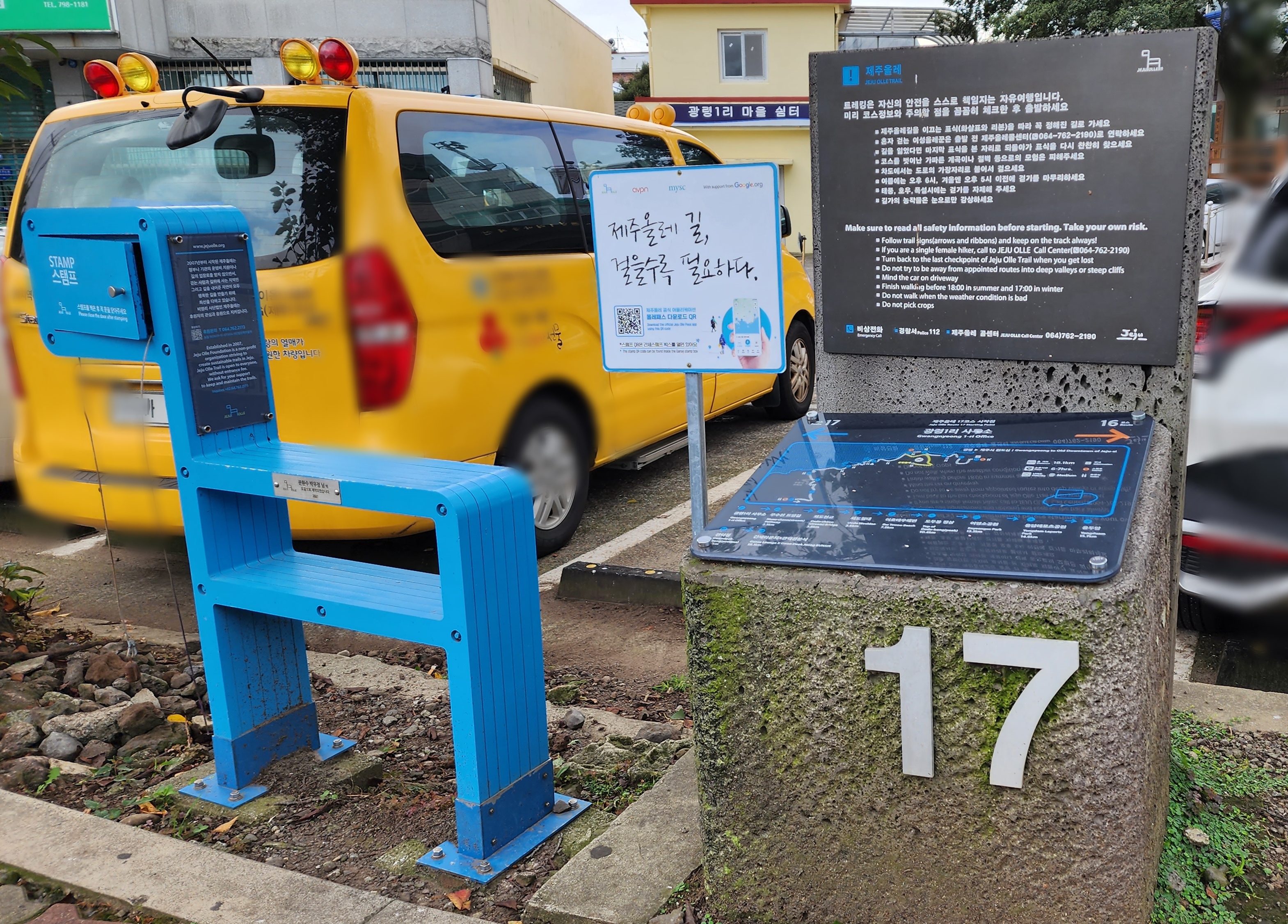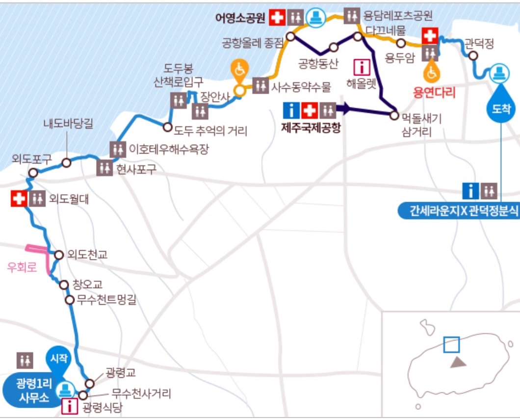 - 광령1리 사무소 -> 무수천트멍길(2.5km) -> 외도월대(5.6km) -> 이호테우해수욕장(7.9km) -> 휠체어구간 시작 (11.7km) -> 어영소공원(13.3km / 중간스탬프) -> 용연다리 (16.1km) -> 간세라운지(간덕정분식)