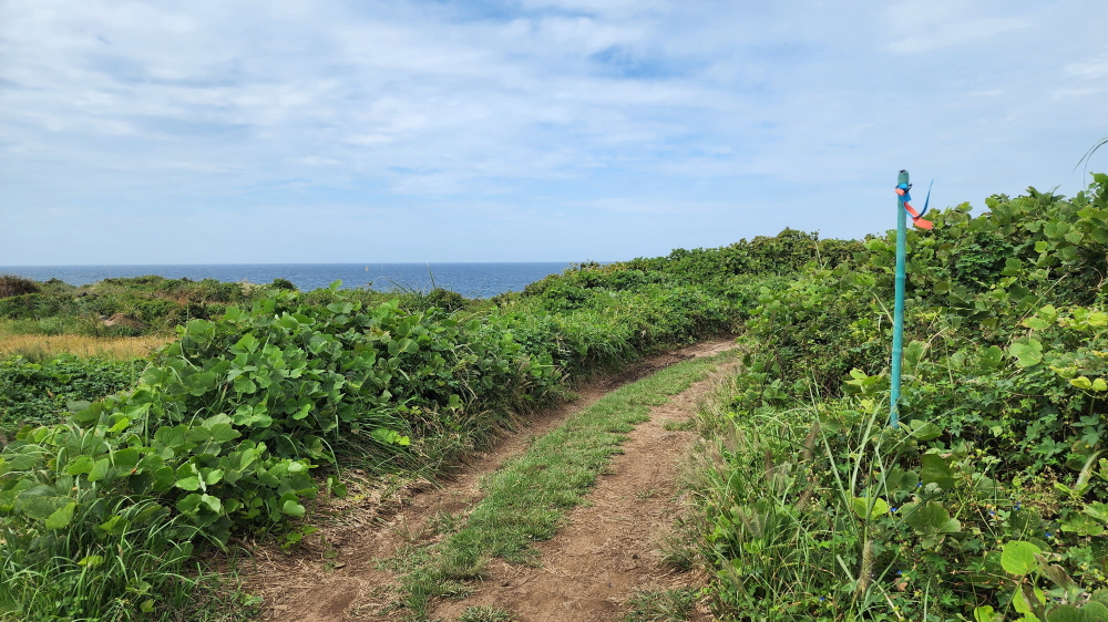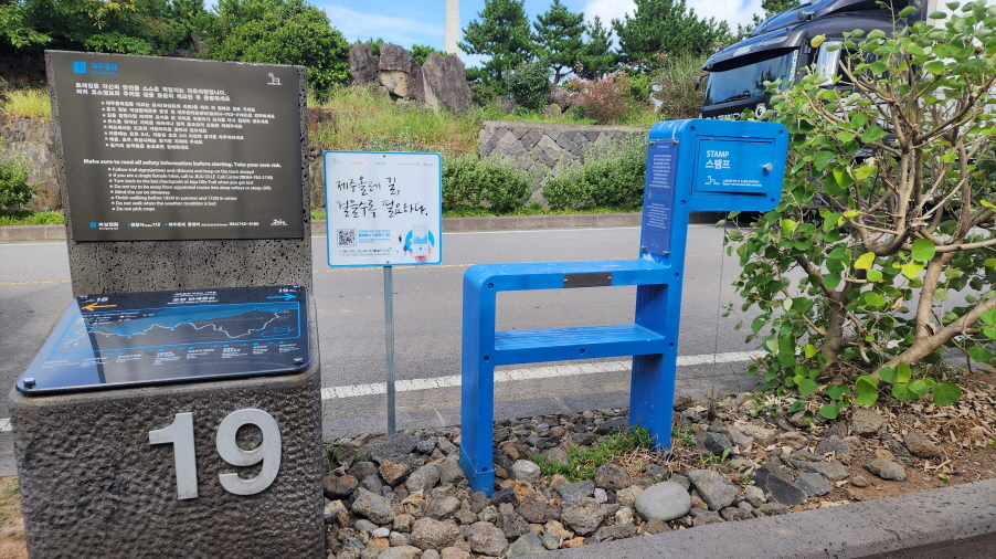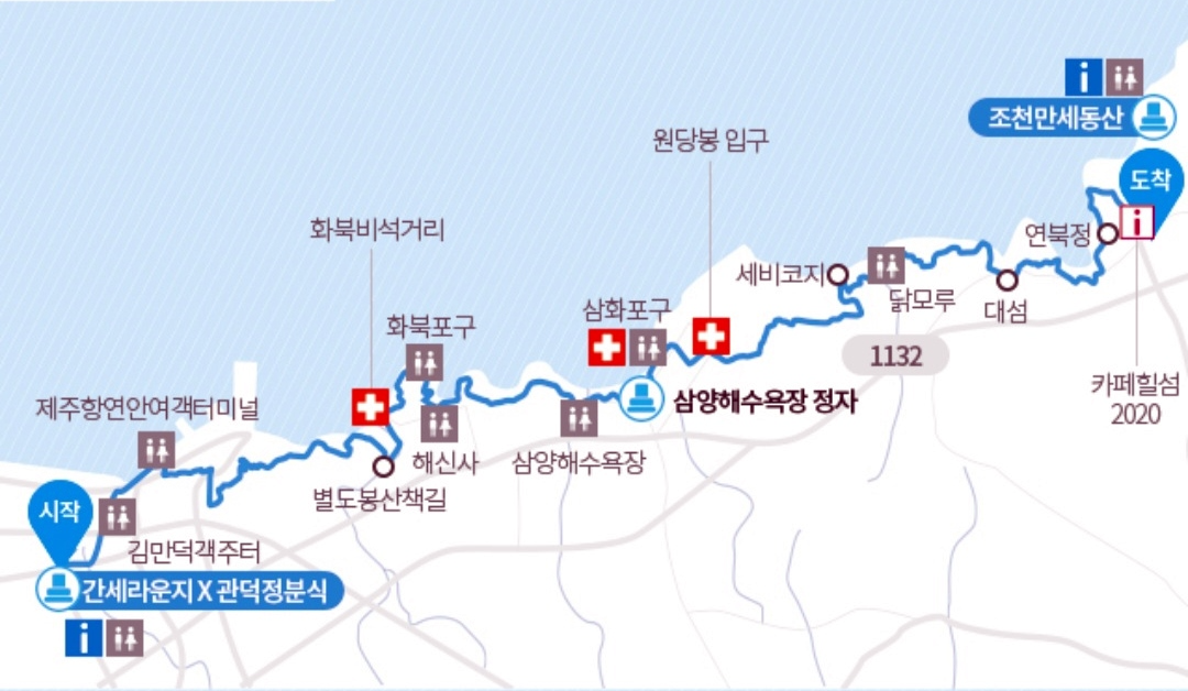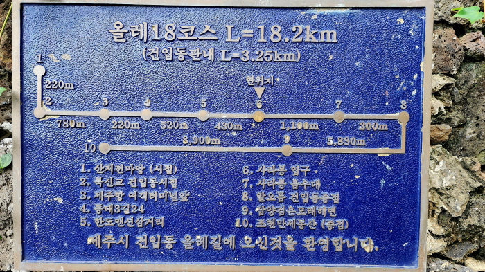 - - 간세라운지 -> 사라봉 정상(망향정) 3.7km -> 별도봉 산책길 (5.3km) -> 하북포구 (7.5km) -> 삼양해수욕장 (10.5km) -> 닭모루(14.5km ) -> 연북정(18.5 km) -> 조천만세동산 (19.7km)