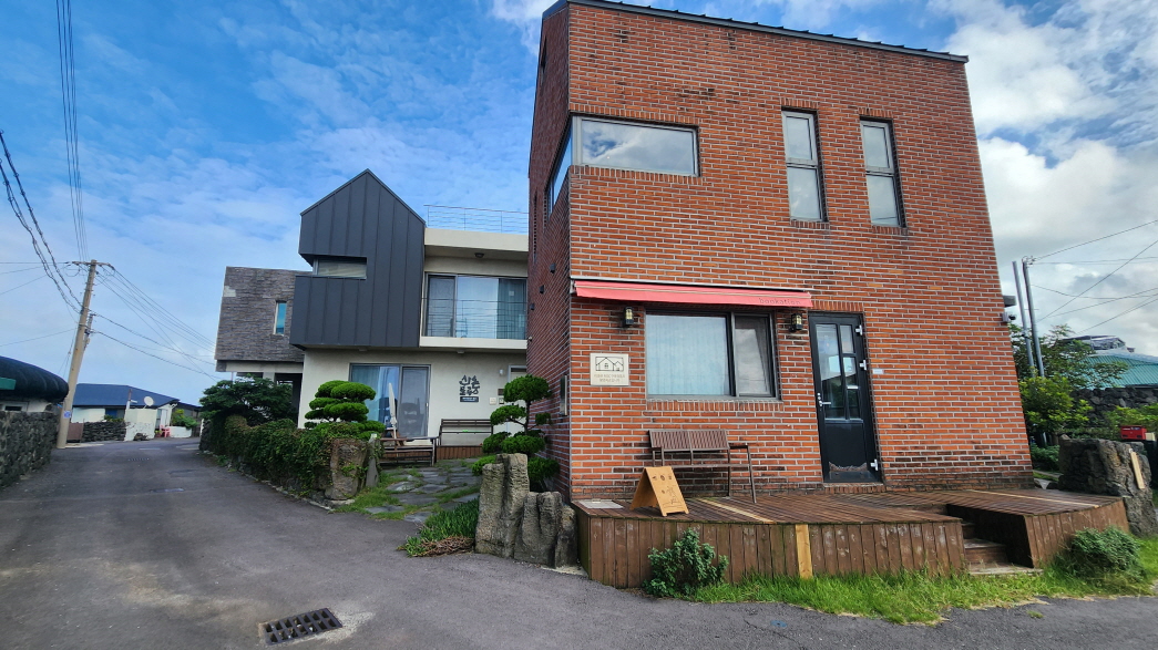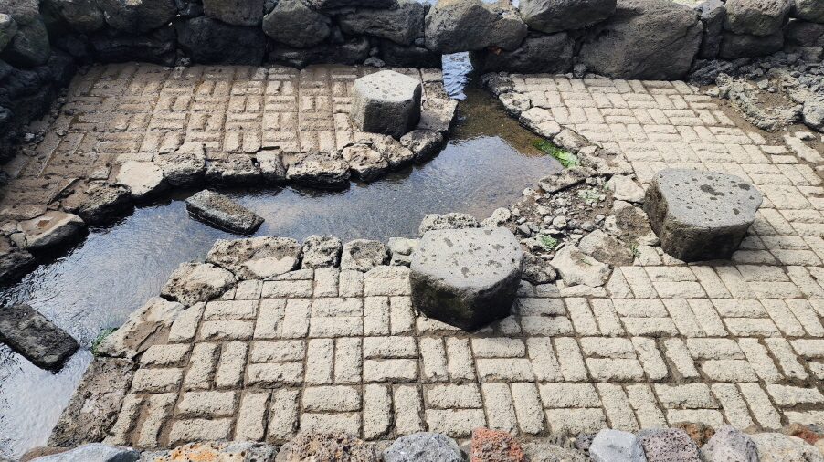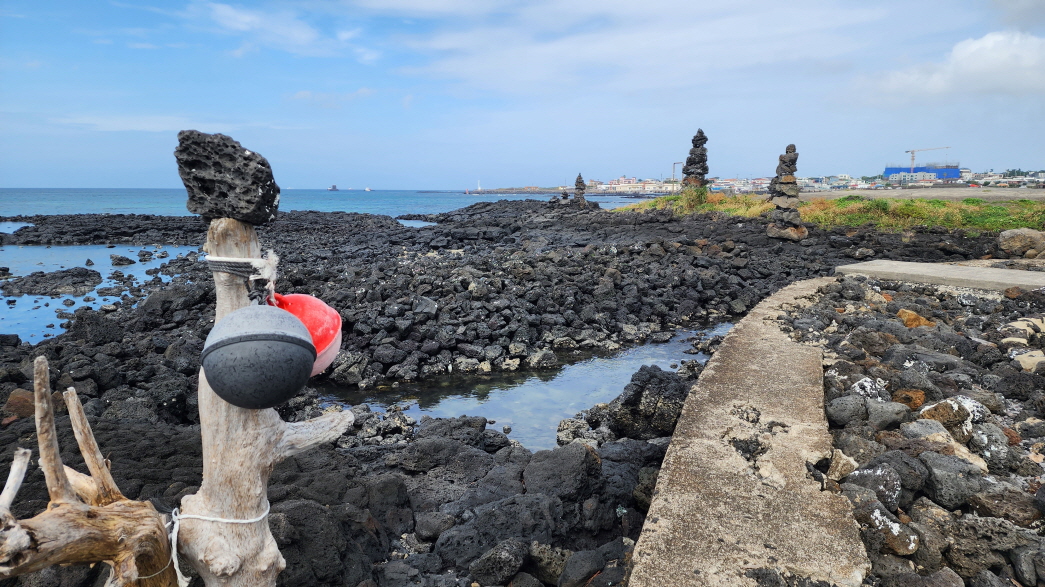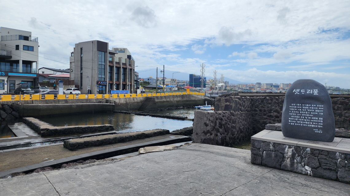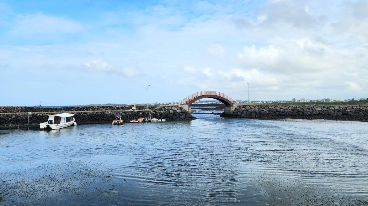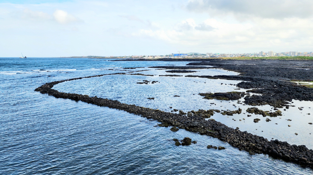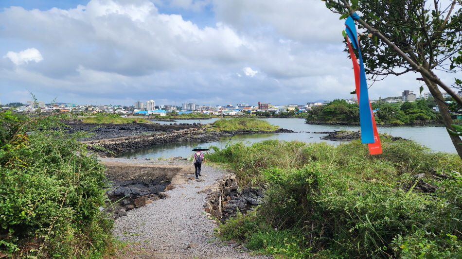- 조천마을과 신촌마을의 경계에 위치한 섬, 점성이 낮아 넓은 지역으로 퍼지면서 흘러내린 용암류가 표면만 살짝 궃어져 평평하게 만들어진 지형이 특징이다.