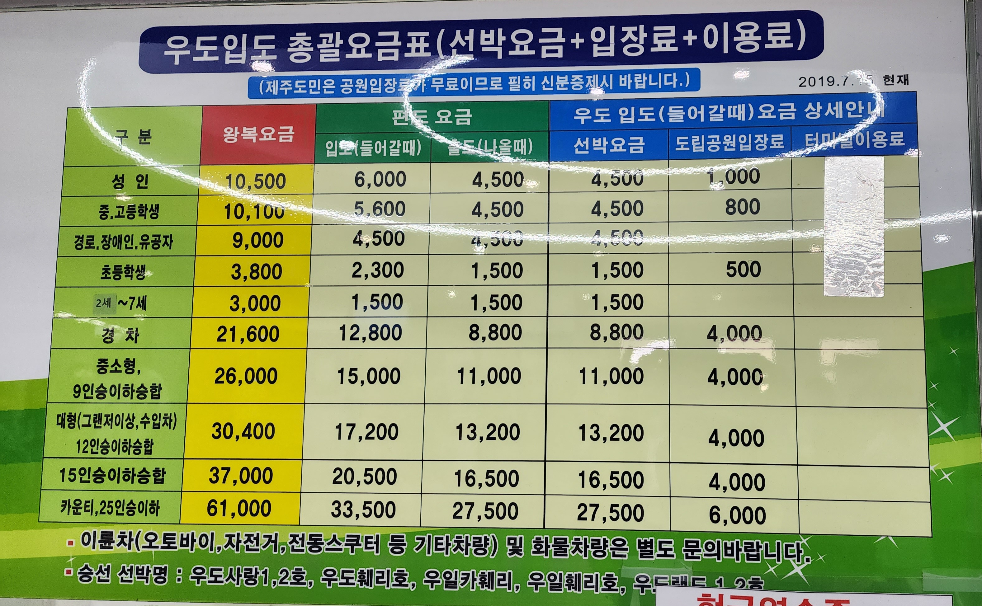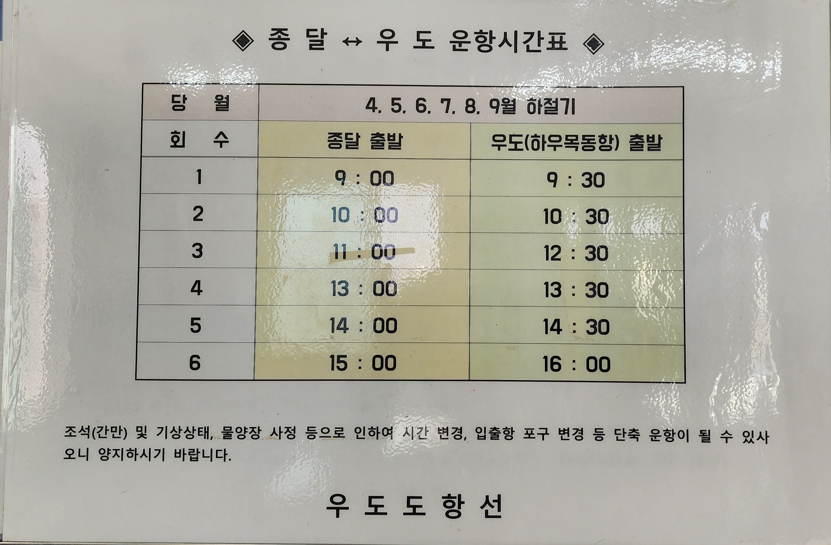 - 종달리에서 우도도항선은 1~2시간 간격으로 운영되며, 하우목동항으로 들어간다. 나올 때도 시간에 맞추어 다시 그 배를 타야 하므로 시간이 다소 애매하다. (위의 배시간 표)
