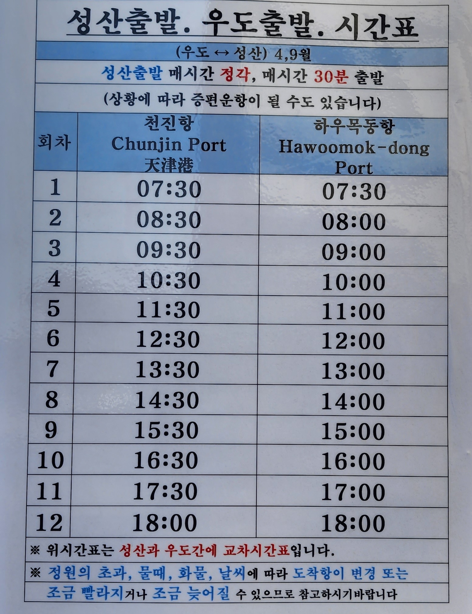 - 성산항에서는 정각, 매시 30분, 간격으로 자주 있기 때문에 성산항에서 우도를 들어가는 것이 보편적이고, 돌아나오는 배도 오후6시까지 있으므로 우도에서 충분히 시간을 보낼 수 있다.