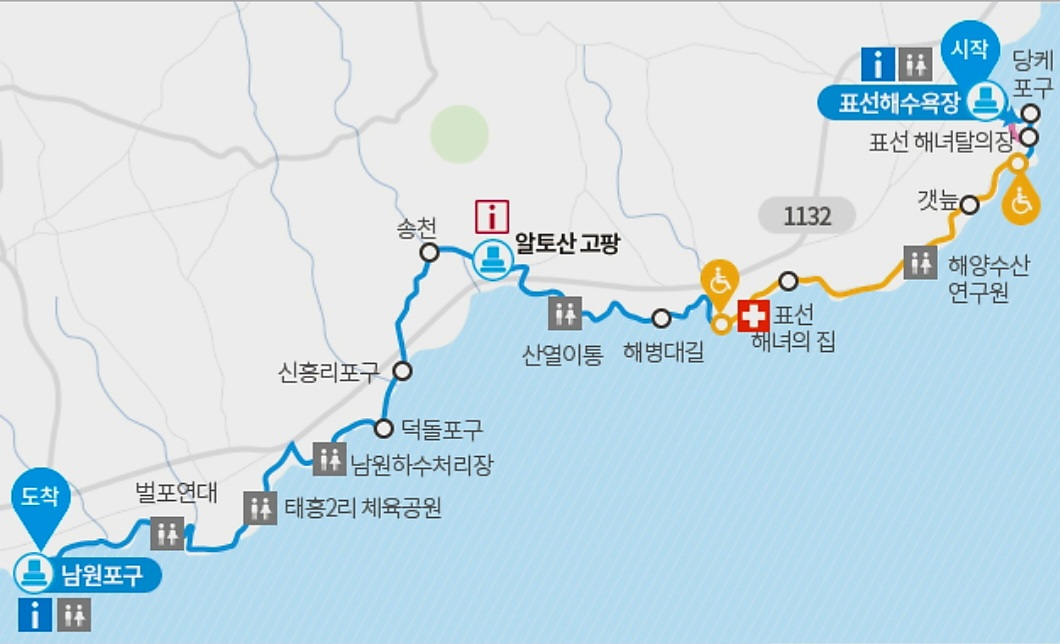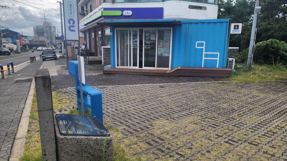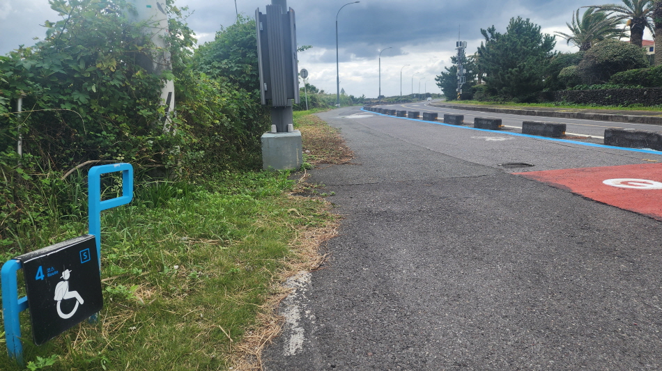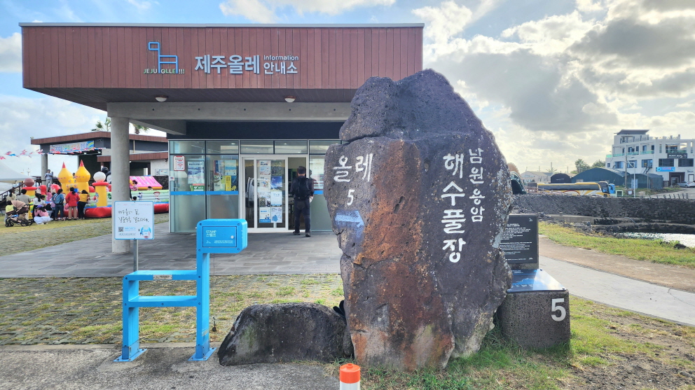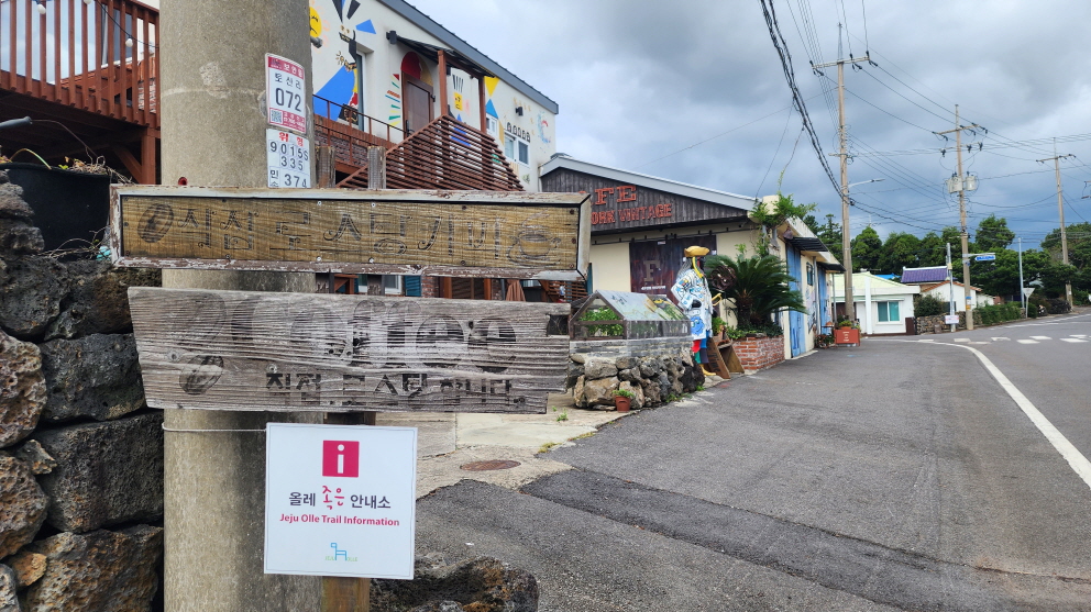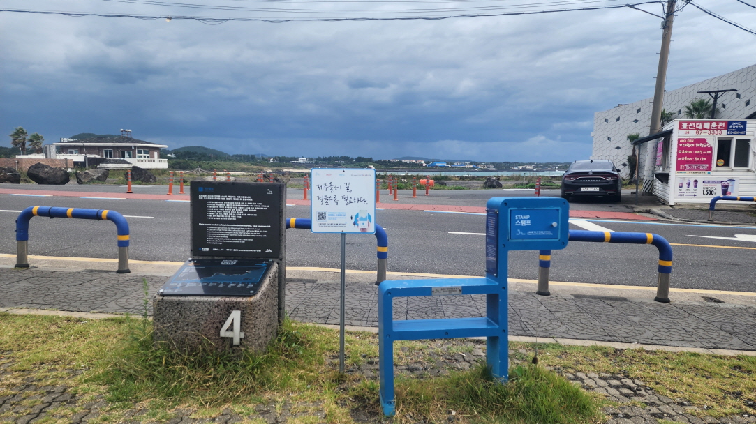 - 3코스 끝날 때 표선해수욕장에서 서핑을 하고 있는 사람들을 구경하느라 넋을 잃고 정신없이 걷다가 올레종점을 찾느라 헤매서, 이번에는 시작점이니 정확히 찾아갔다. 해수욕장안에 있는 것이 아니라 제주 민속촌 앞블럭 도로가에 서 있다.