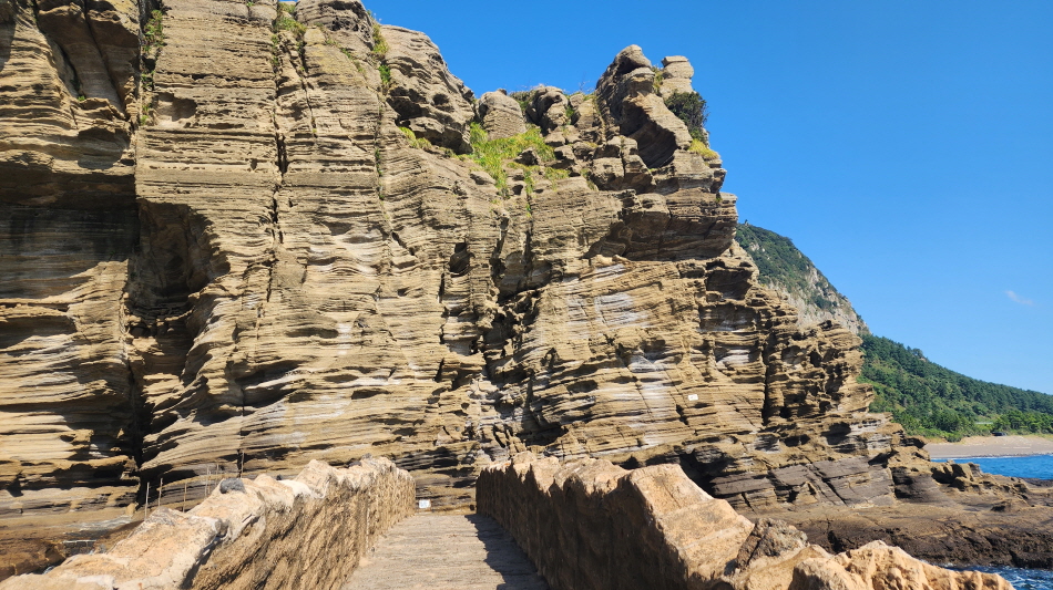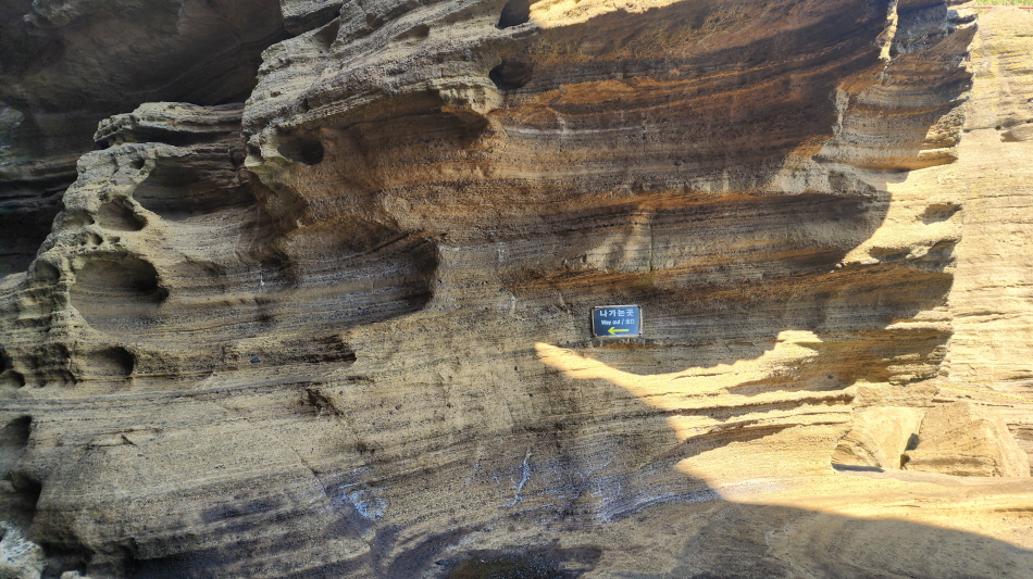 - 탐방로를 걷다보면 서로 다른 방향으로 쌓여 있는 화산재 지층을 볼 수 있는데, 이는 화산이 분출하는 도중 3번의 분화구가 막히고 이동하면서, 서로 다른 방향에서 화산 물질이 운반되어 쌓였기 때문이다.