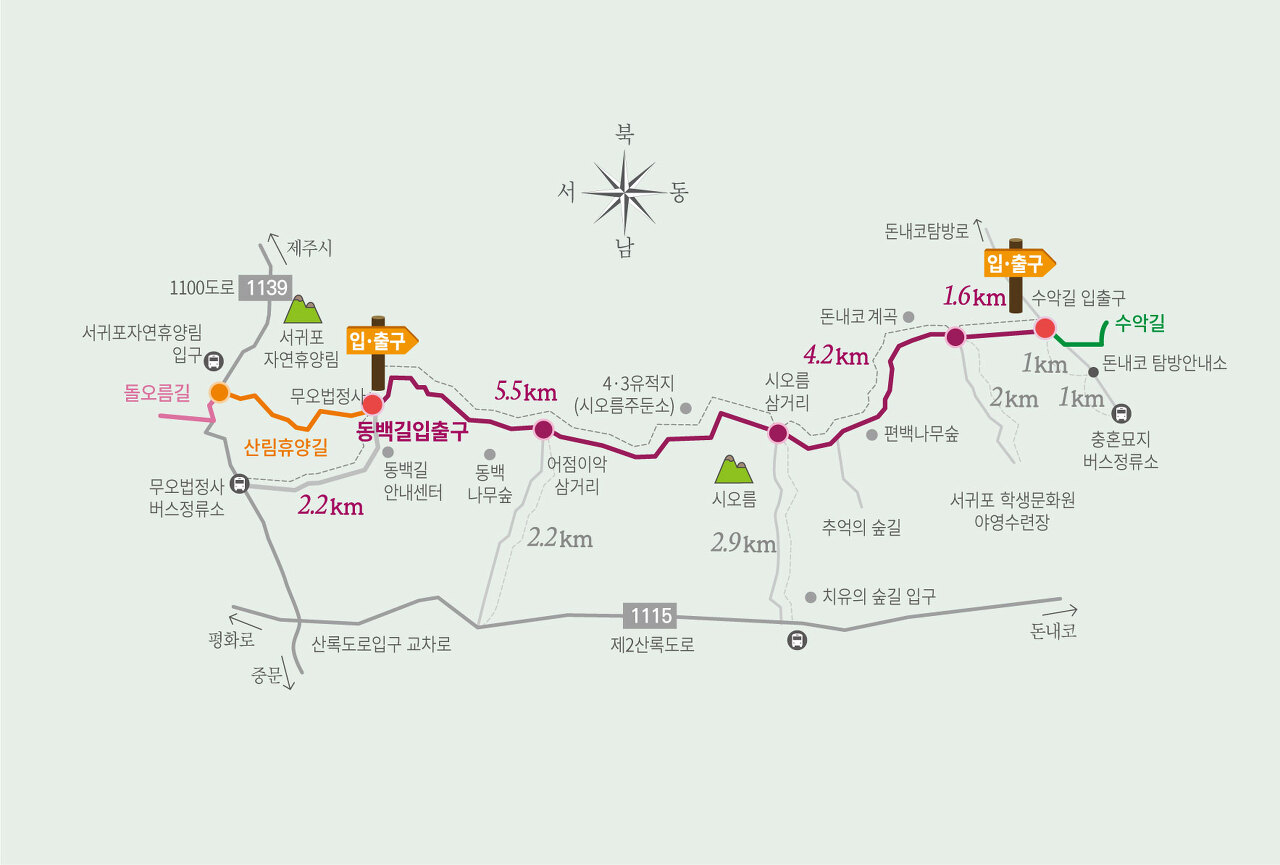 - 서귀포자연휴양림(유료입장) 2.3km 구간(산림휴양길)을 통과하여 동백길로 진입하면 무오법정사 항일기념탑과 전망대가 있는 구간으로 나오게 된다. 이렇게 진입하여 걸으면 기존에 대중교통을 이용하여 법정사입구에서 진입하던 방식과 병행하며 거리구간과 비슷하게 시간이 걸리게 된다.