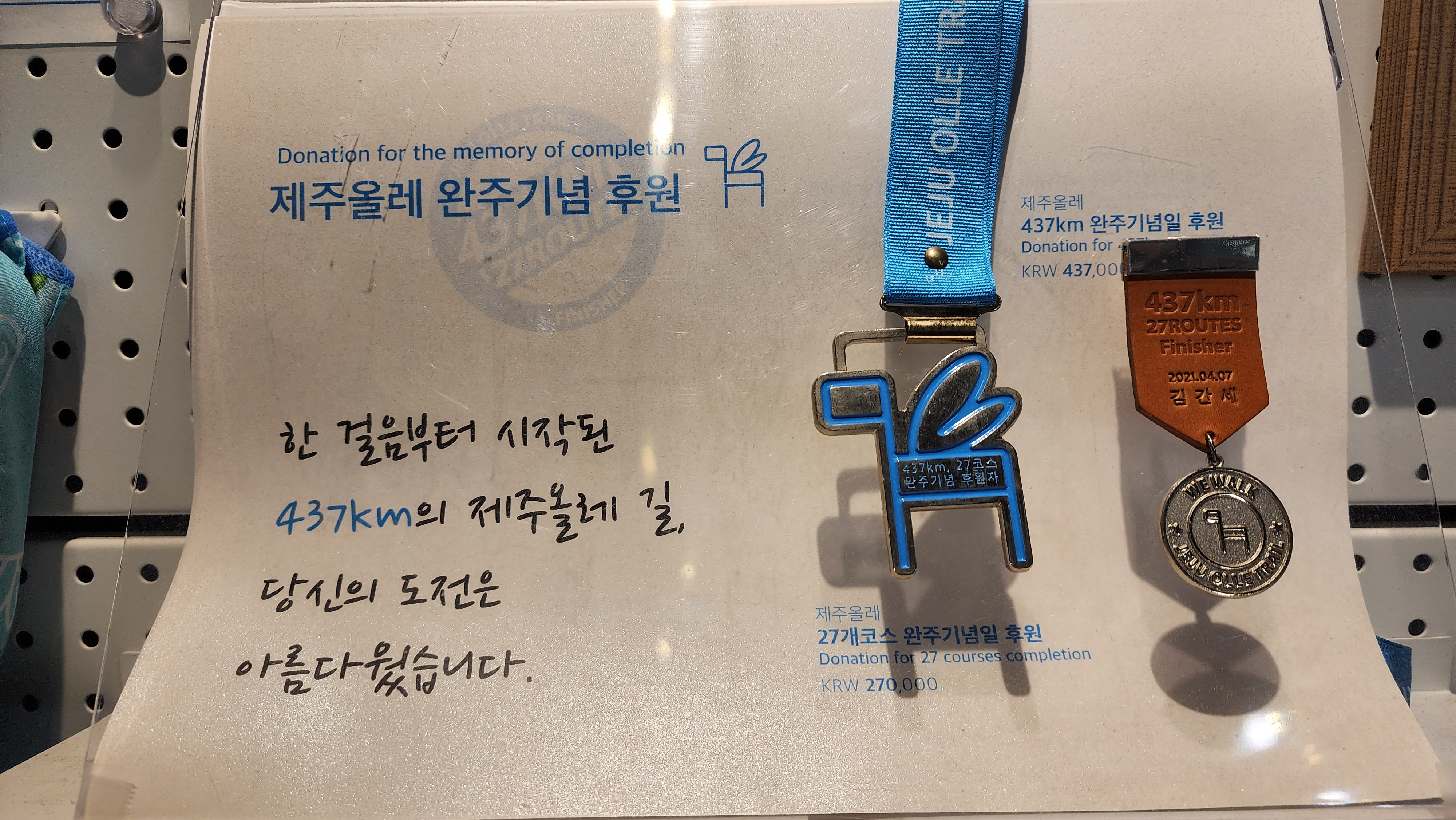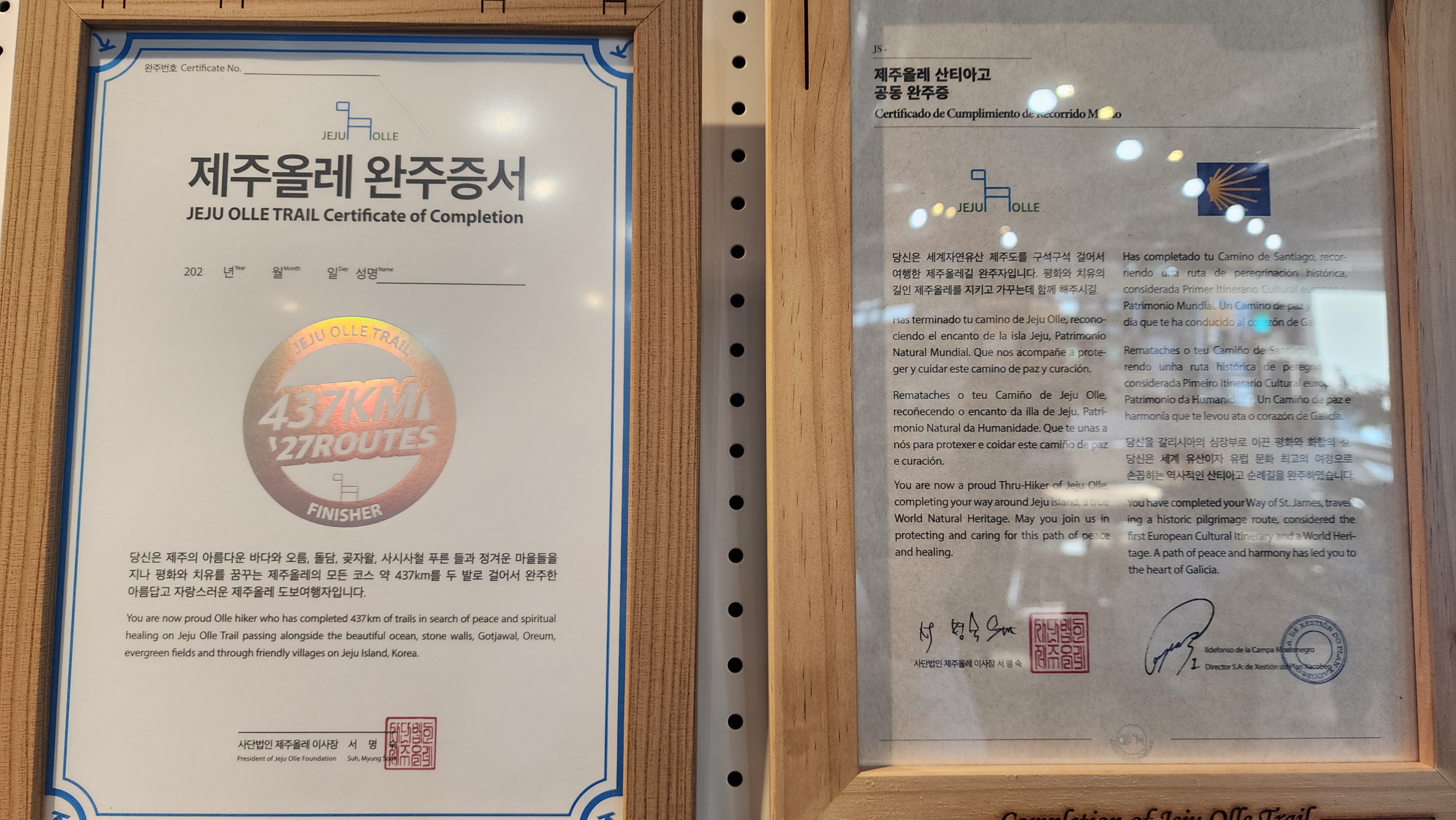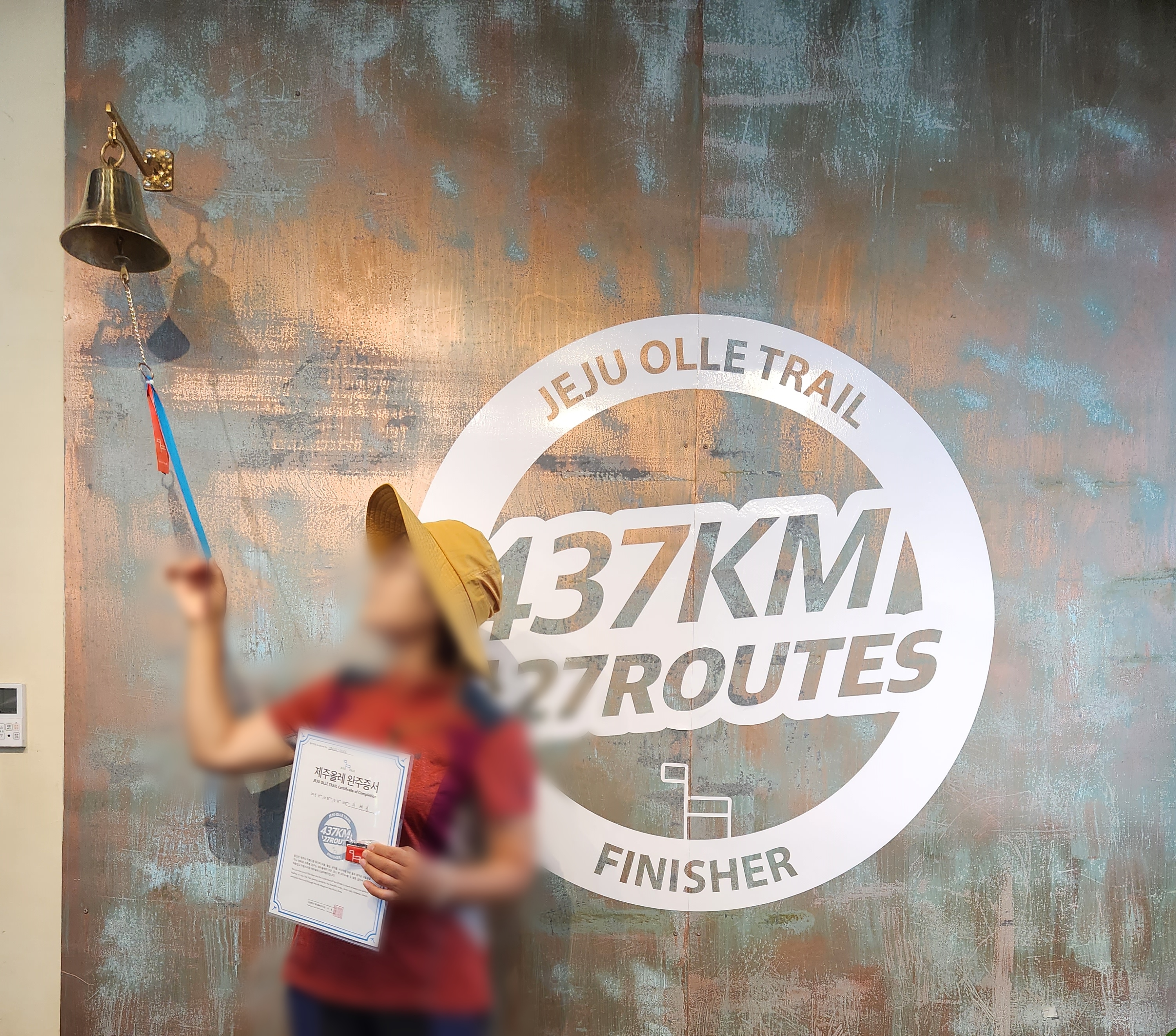 - 완주증을 받고, 종을 울린다. 그리고 기념사진을 찍고, 올래명예의 전당에 나의 사진이 올라간다.