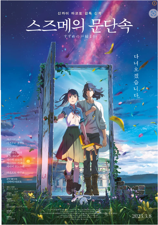 - (내용) 한 소녀가 우연히 만난 청년과 재난의 문을 닫는 모험에 뛰어들게 되는 이야기를 다룬 애니메이션 영화