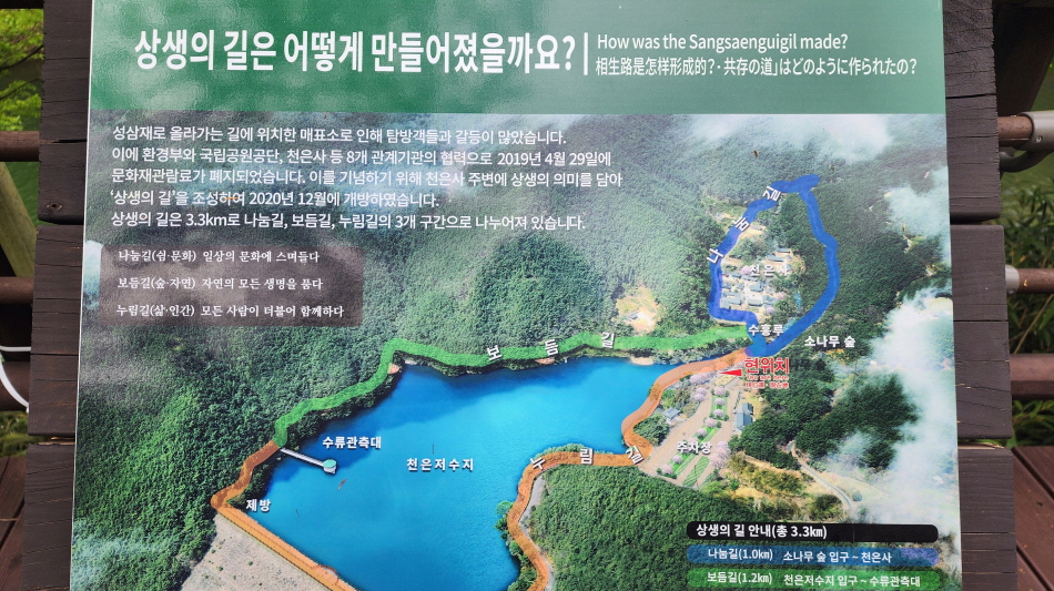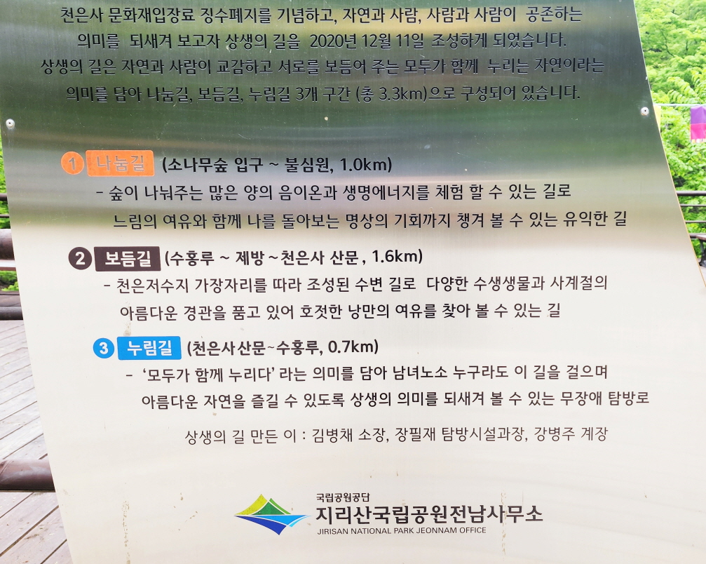 - 천은사를 여러번 다녀오고, 그곳에서 템플스테이도 오래전에 했건만 '생생의 길은 그 후에 생겼는지 이름이 지금 붙여진 건지 알 수 없지만, 한 번도 걸어보지 못해서 노고단에서 내려오는 길에 천은사에 들렸다.