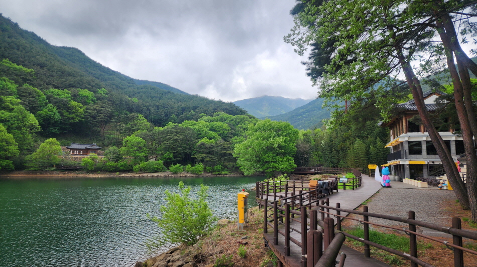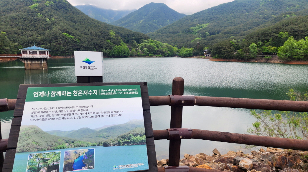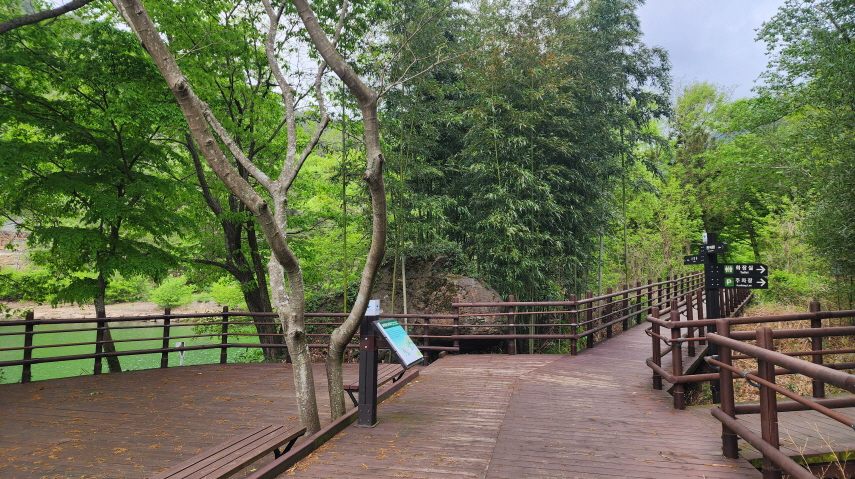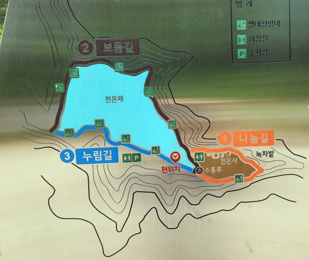 이곳부터 저수지 뚝(제방) 까지를 '누림길'. 건너편을 '보듬길', 그리고 천은사 뒤로 소나무숲길을 따라 걷는 길을 '나눔길'이라고 한다.