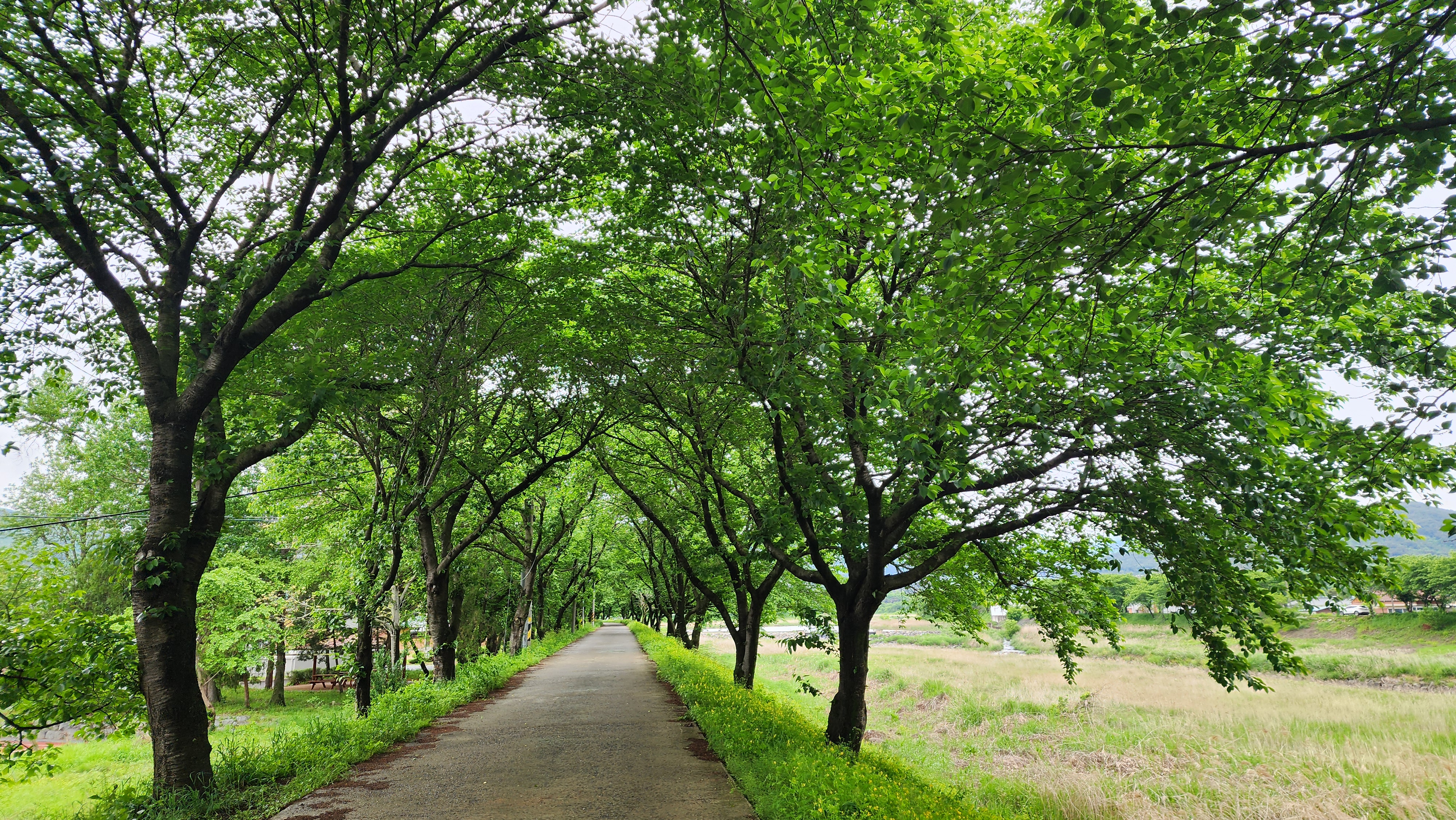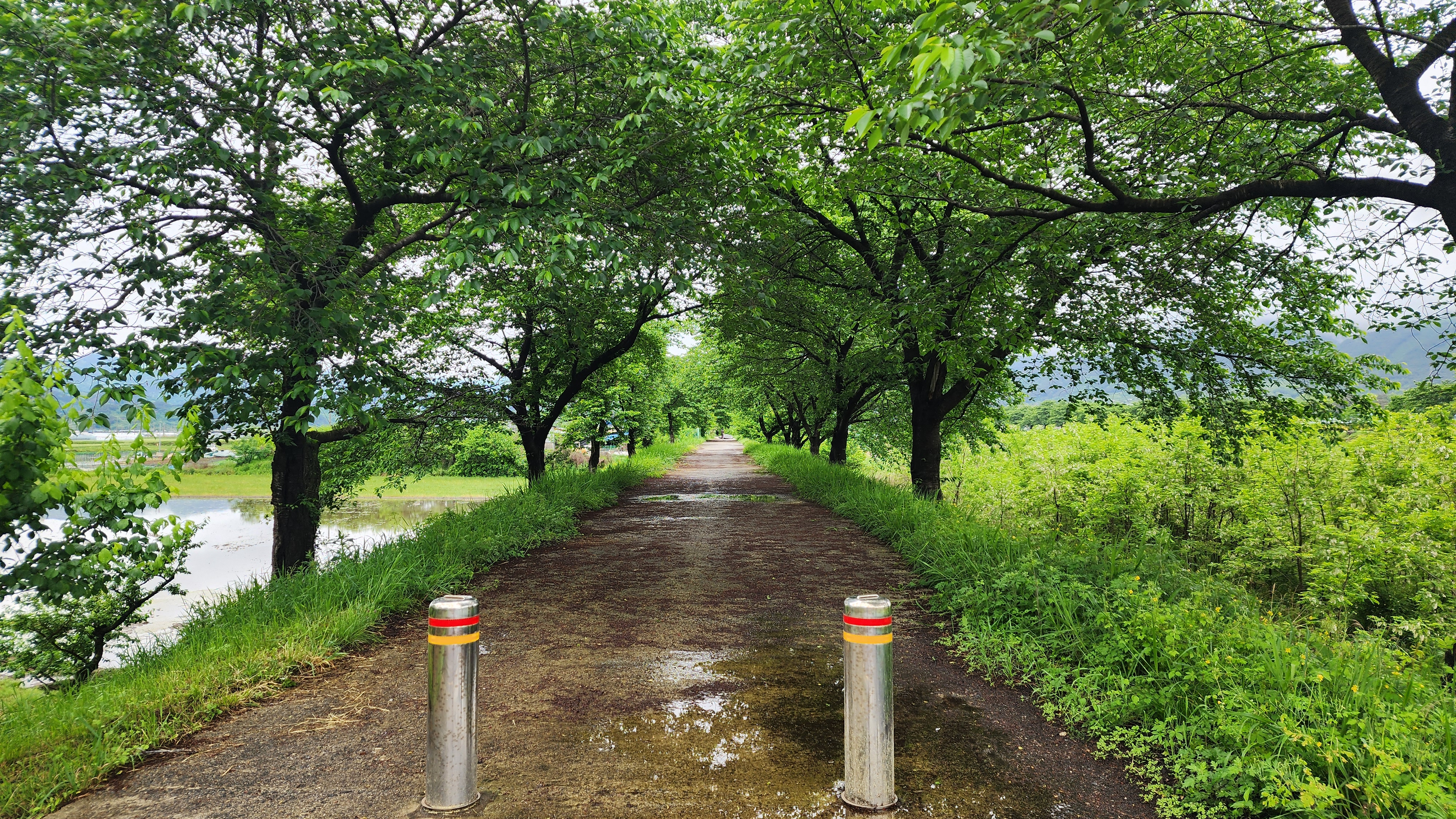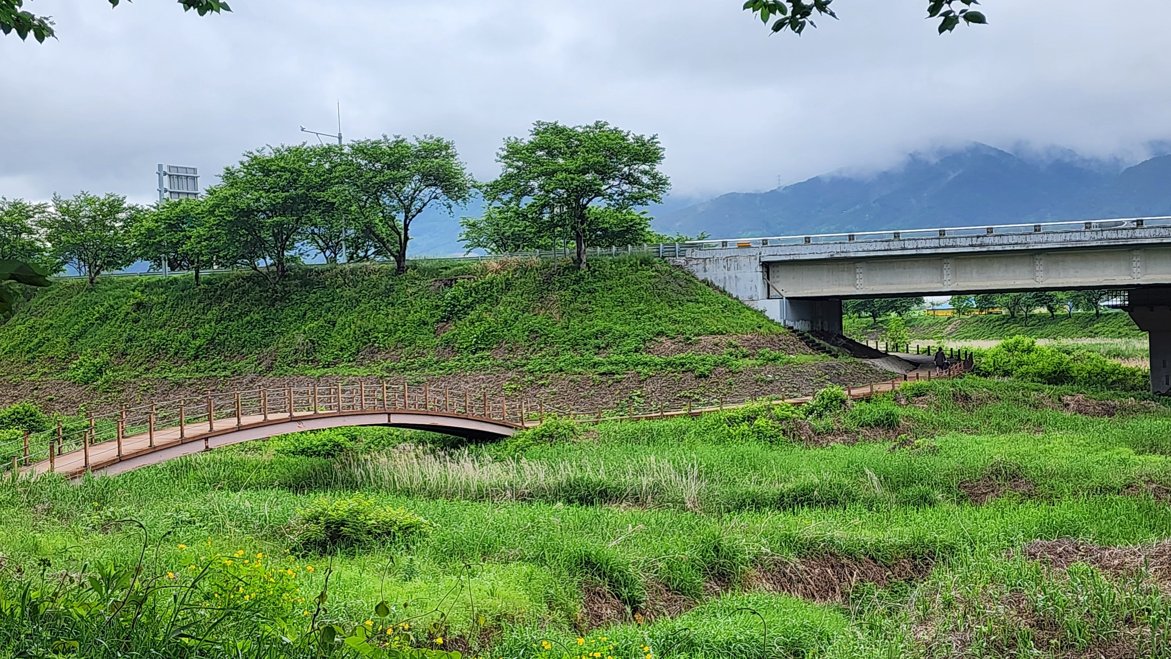 - 계속 일직선으로 이어지던 벚나무길이 이곳에서 나무다리를 건너 도로 밑을 지나 건너편 사시천 방향으로 간다.