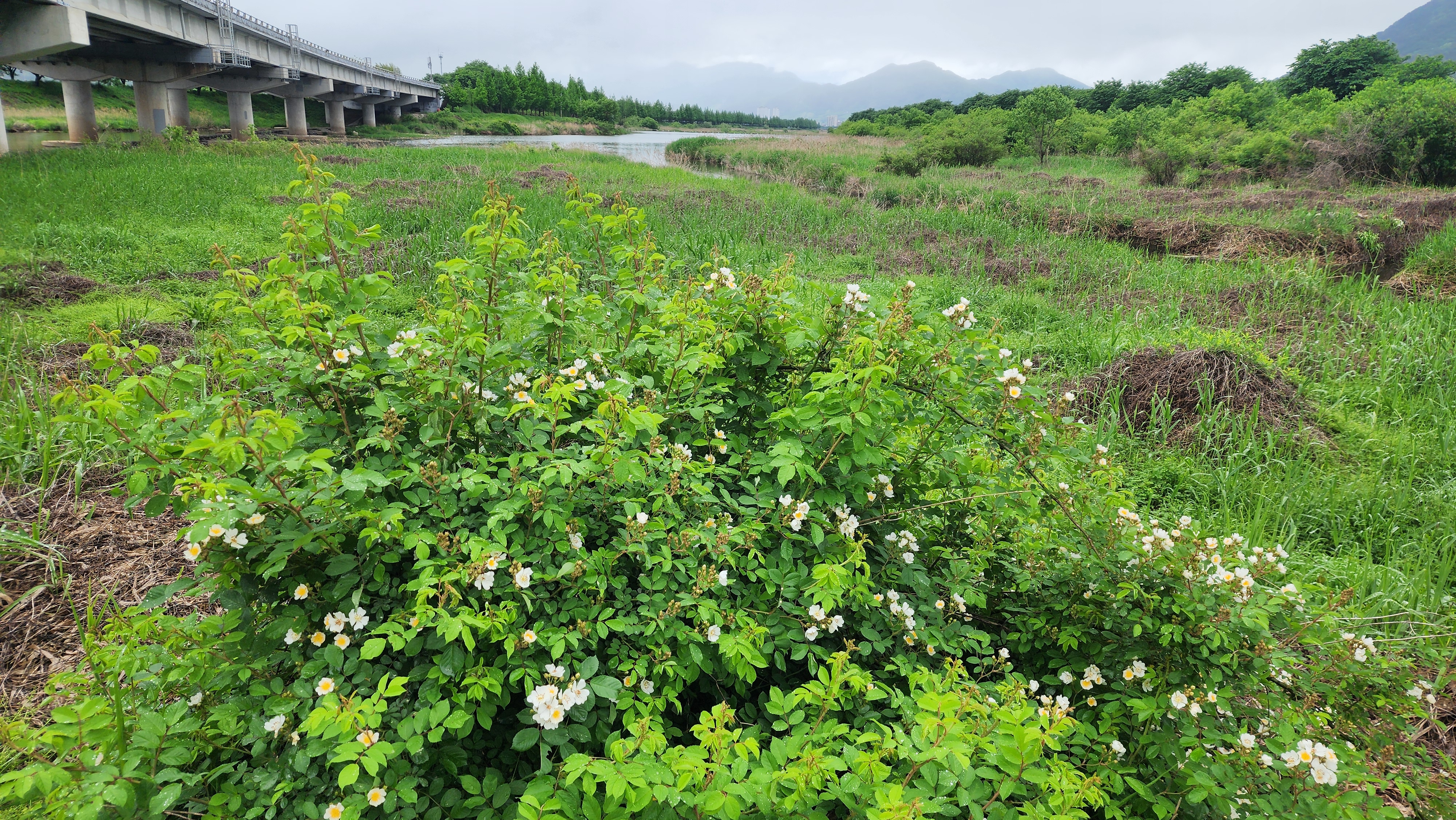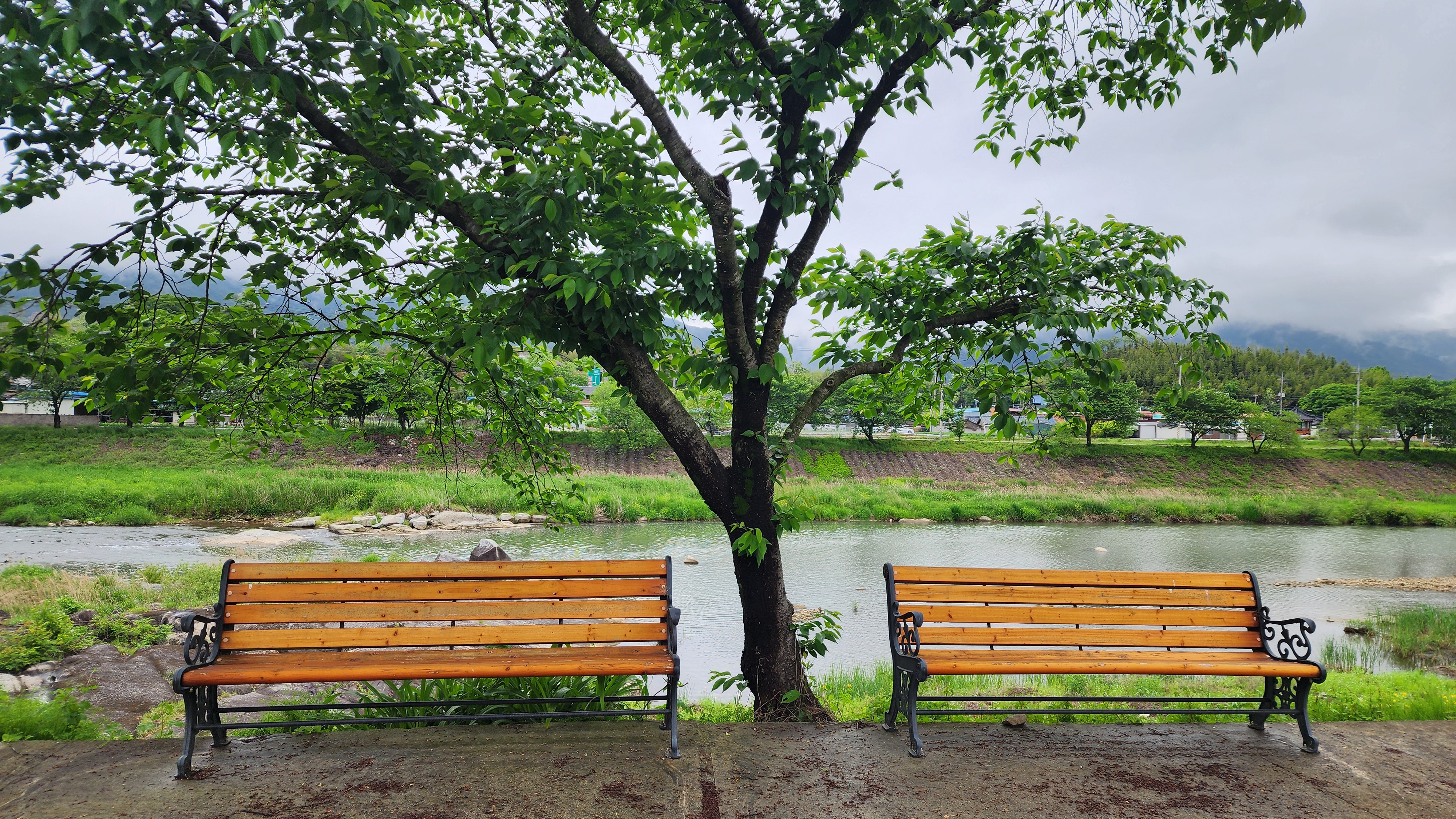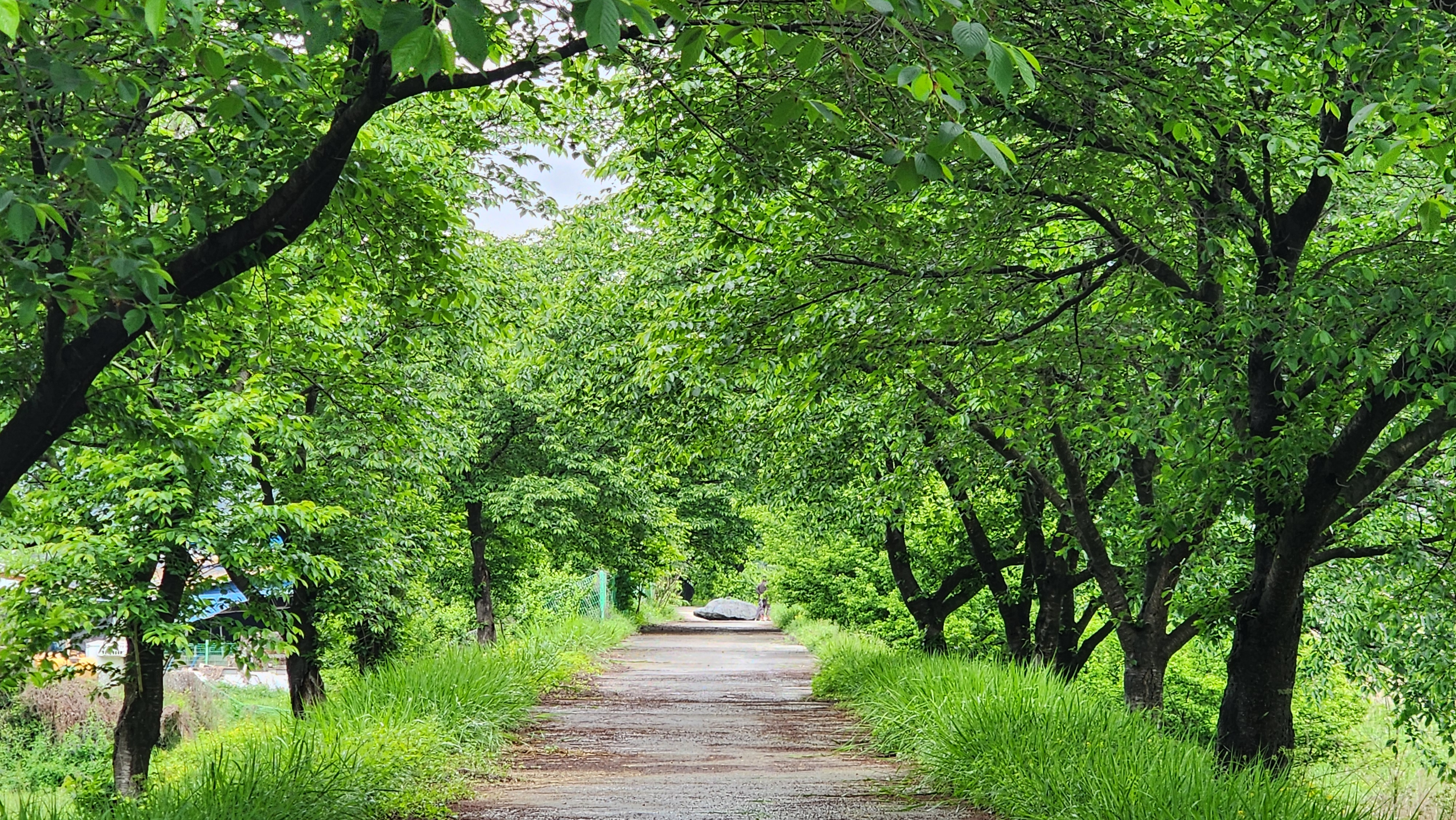 - 계속 일직선으로 이어지던 벚나무길이 이곳에서 나무다리를 건너 도로 밑을 지나 건너편 사시천 방향으로 간다.
