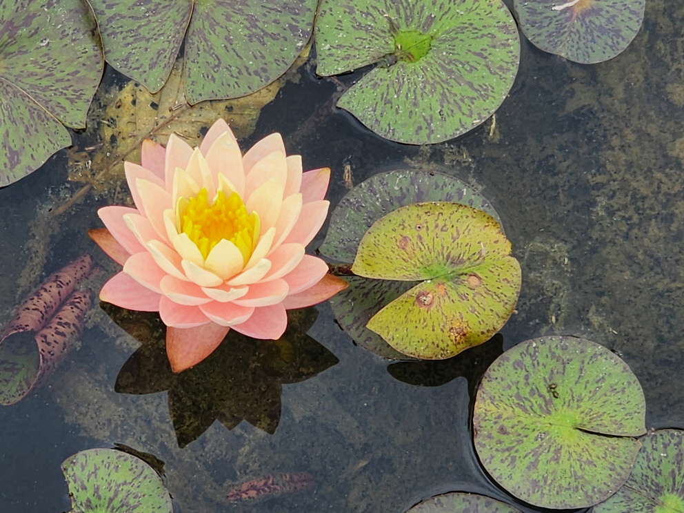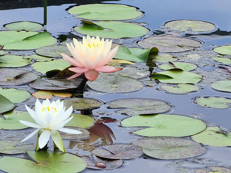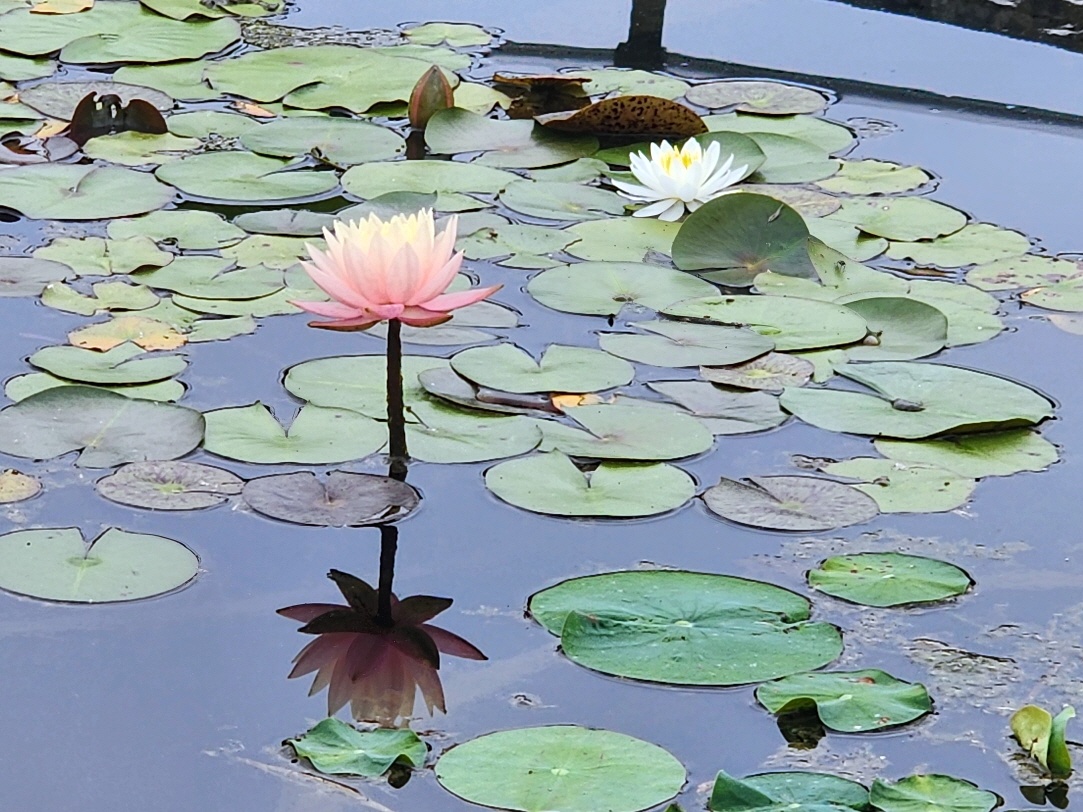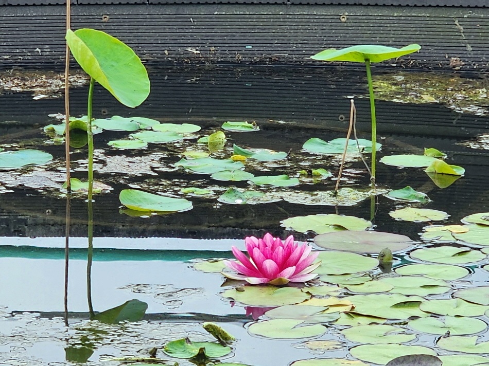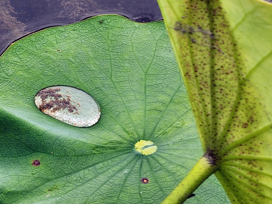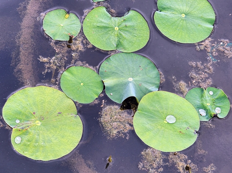 - 레이크 전망대 안 연못에 핀 연꽃들, 연꽃잎에 맺힌 물방울