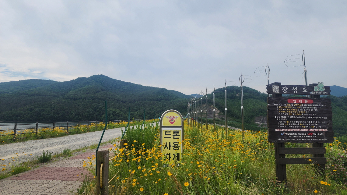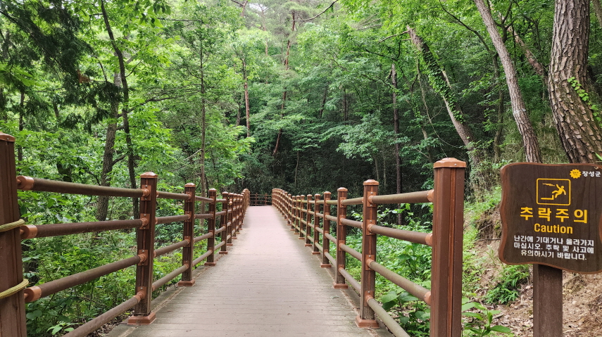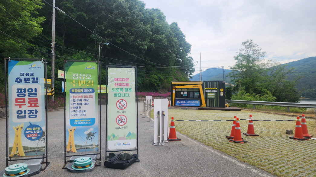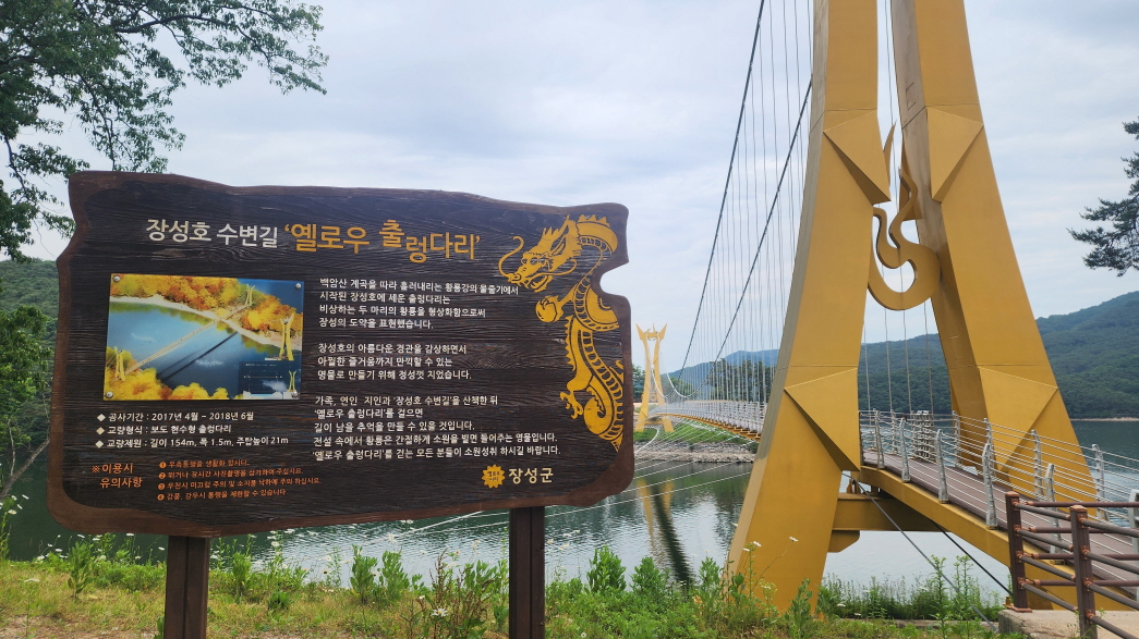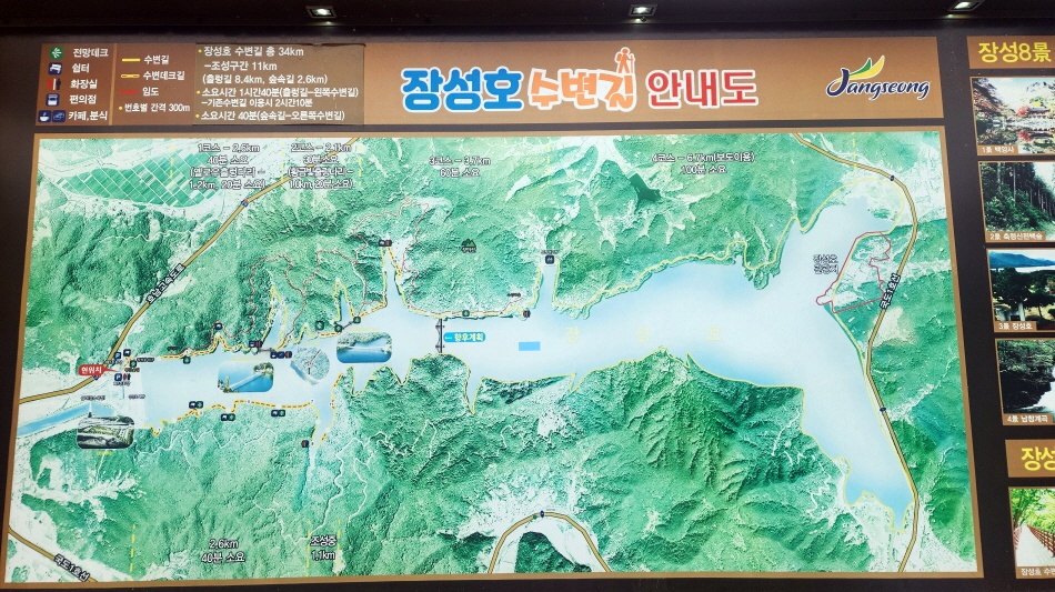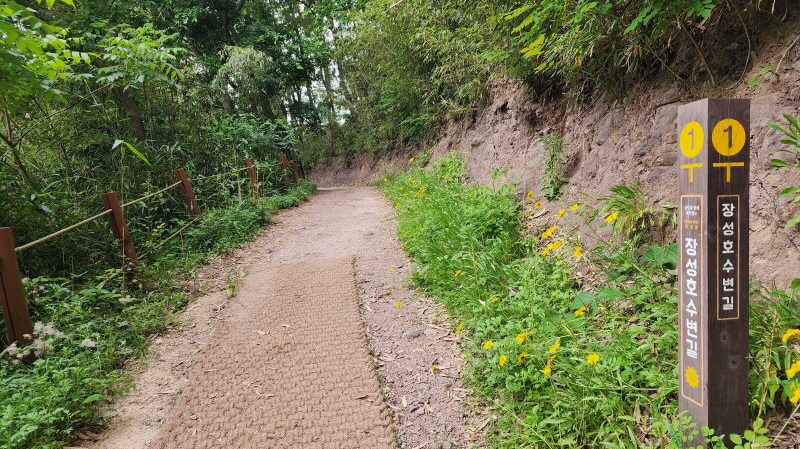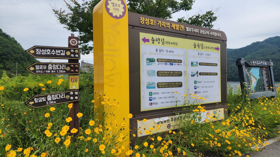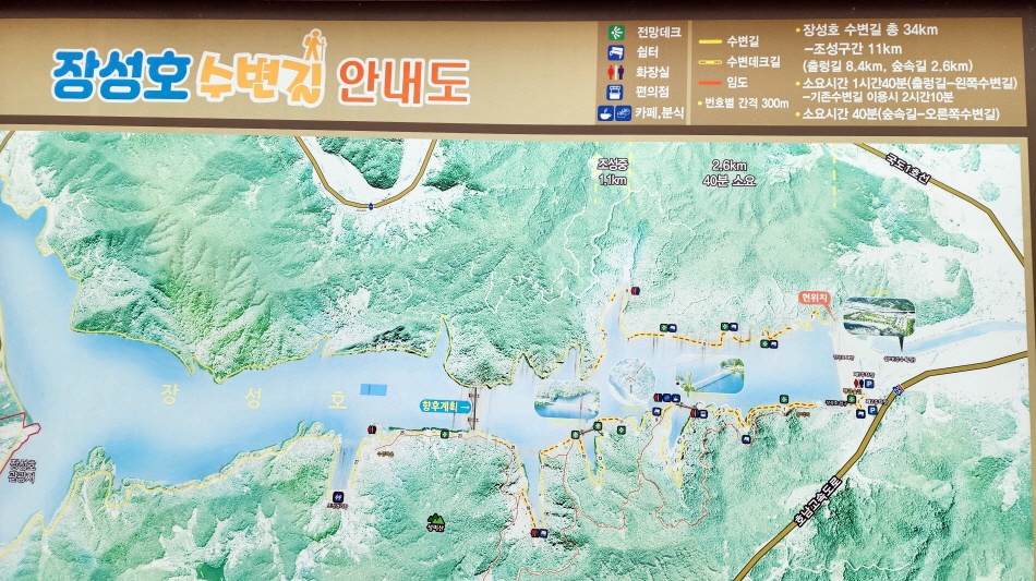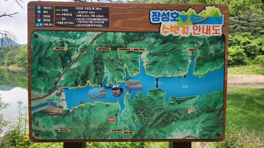 - 장성호 수변길은 총 34km이다. 그중 현재 데크 등으로 조성되어 있는 길은 댐에서 왼쪽길로 호수산책로를 따라 도는 '출렁길' (8.4km)와, 댐을 건너 오른쪽으로 도는 '숲속길'(2.6km)로 되어 있다.