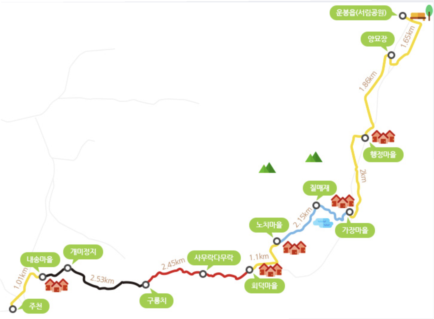 주천에서 구룡치까지 오르는 길은 가파른 산길이라 힘이드는 반면, 운봉에서 주천으로 내려오는 길은 내리막 길이라 힘이 전혀 들지 않는다.