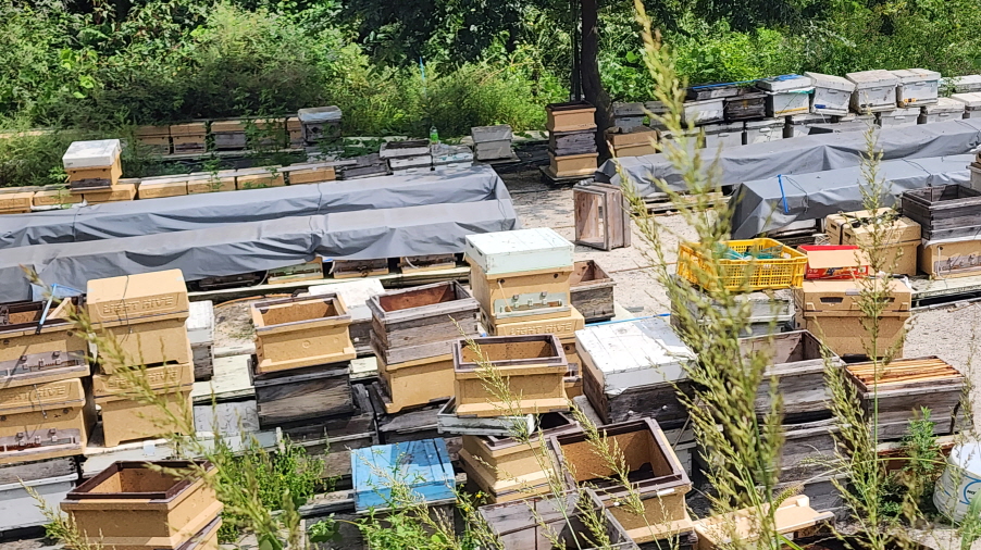 - 양봉 상자와 '수까치깨'('암까치깨'는 빨간 씨방을 드러내는 것이 암까치깨)