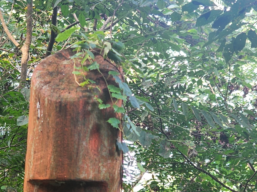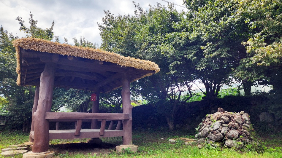 - 인증 스탬프함과 벅스. 정자에서 앉아 휴식을 취하며, 간식을 먹는다.