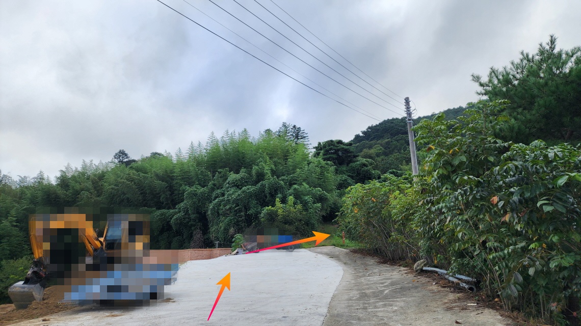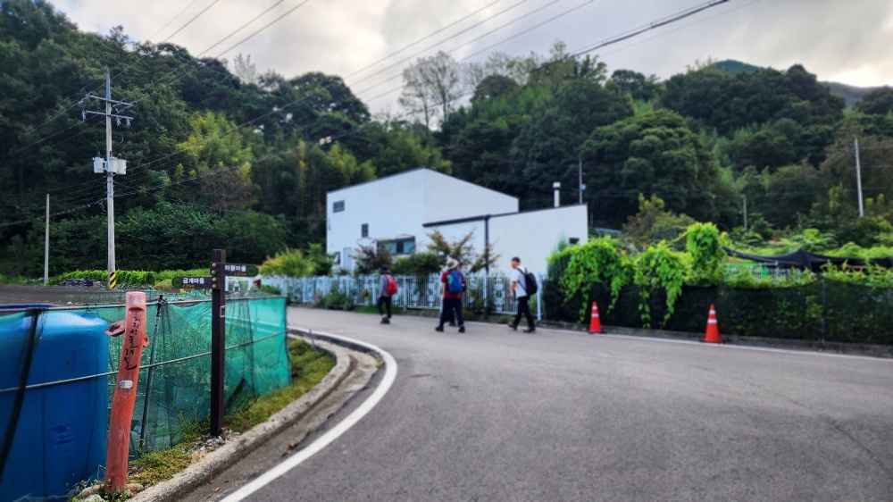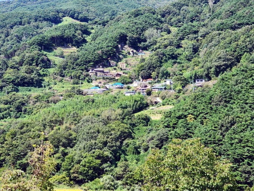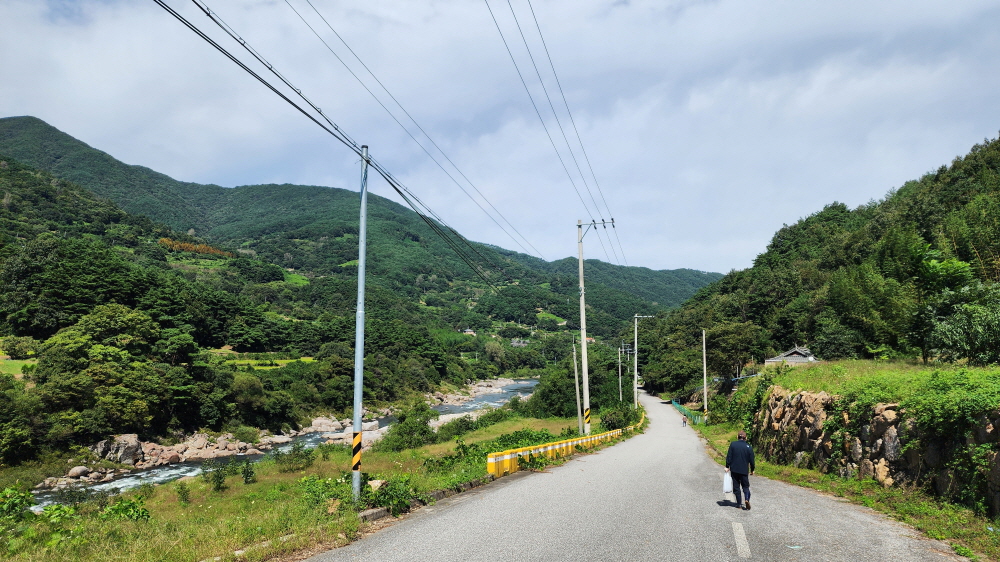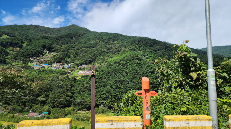 (4) 둘레길을 계곡을 따라 도로를 걸으며 건너편으로 바라본 산 위 마을 풍경