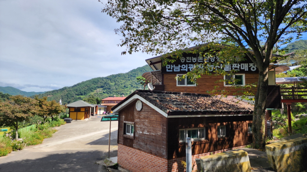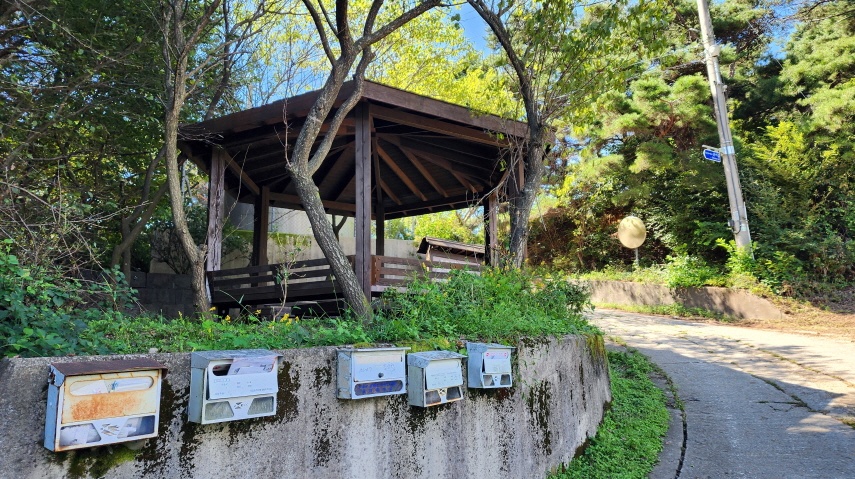 - 고개를 바로 넘어서면 쉼터가 나온다. 운서마을 쉼터, 쉼터 아래 벽에는 우편함이 5개가 달려있다. 아마도 우체국 차가 여기까지만 올라오고, 나머지는 각자 찾아가는 모양이다.