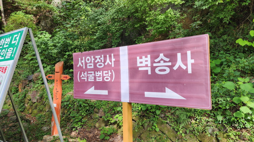 - 서암정사 주차장을 지나 아무 생각없이 위 사진의 삼거리까지 급경사를 내려왔다. 길이 아무래도 이상하여 지도를 보니 벽송사를 지나가야 한다. 이런 ㅠ ㅠ. 다시 급경사 도로를 올라 공사를 하고 있는 길까지 올라가니, 벅스가 공사 안내판에 가려져 보이지 않았다. (처음 시작할 때는 벽송사를 지나가야 한다고 생각했는데, 왜 서암정사만 지나면 내려가는 길이라고 생각했는지...알수가 없다. 나는 벽송사를 갔다가 다시 내려와야 하는 줄 착각을 하고... 아무튼 일행에게 너무도 미안했다. 이제 나이를 먹으니, 머리가 빨리 회전하지 않는 모양이다. 흑흑...)