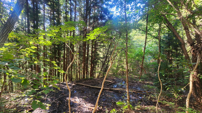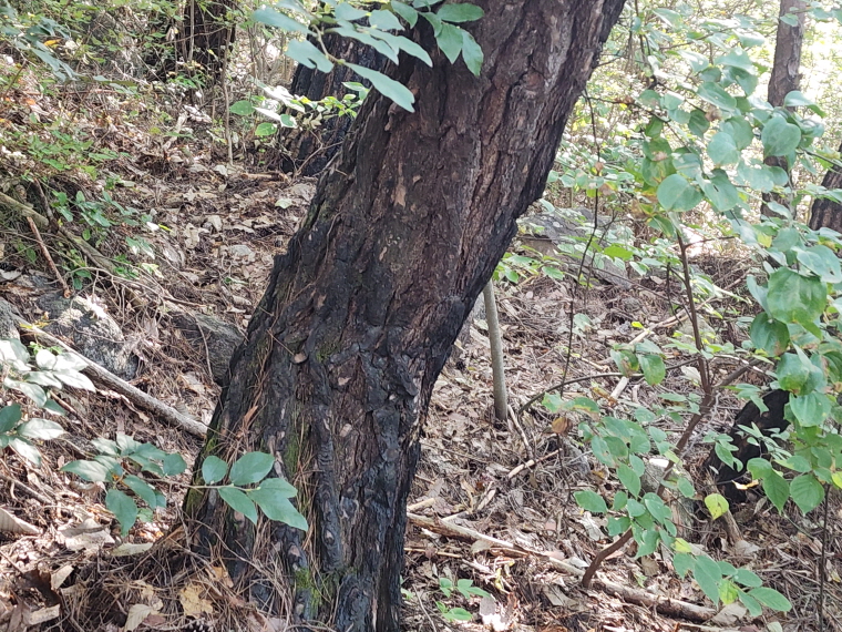 - 산불 피해 나무들이 보이기 시작한다. 다행히 표피만 그을리고 나무들은 살아남았다.