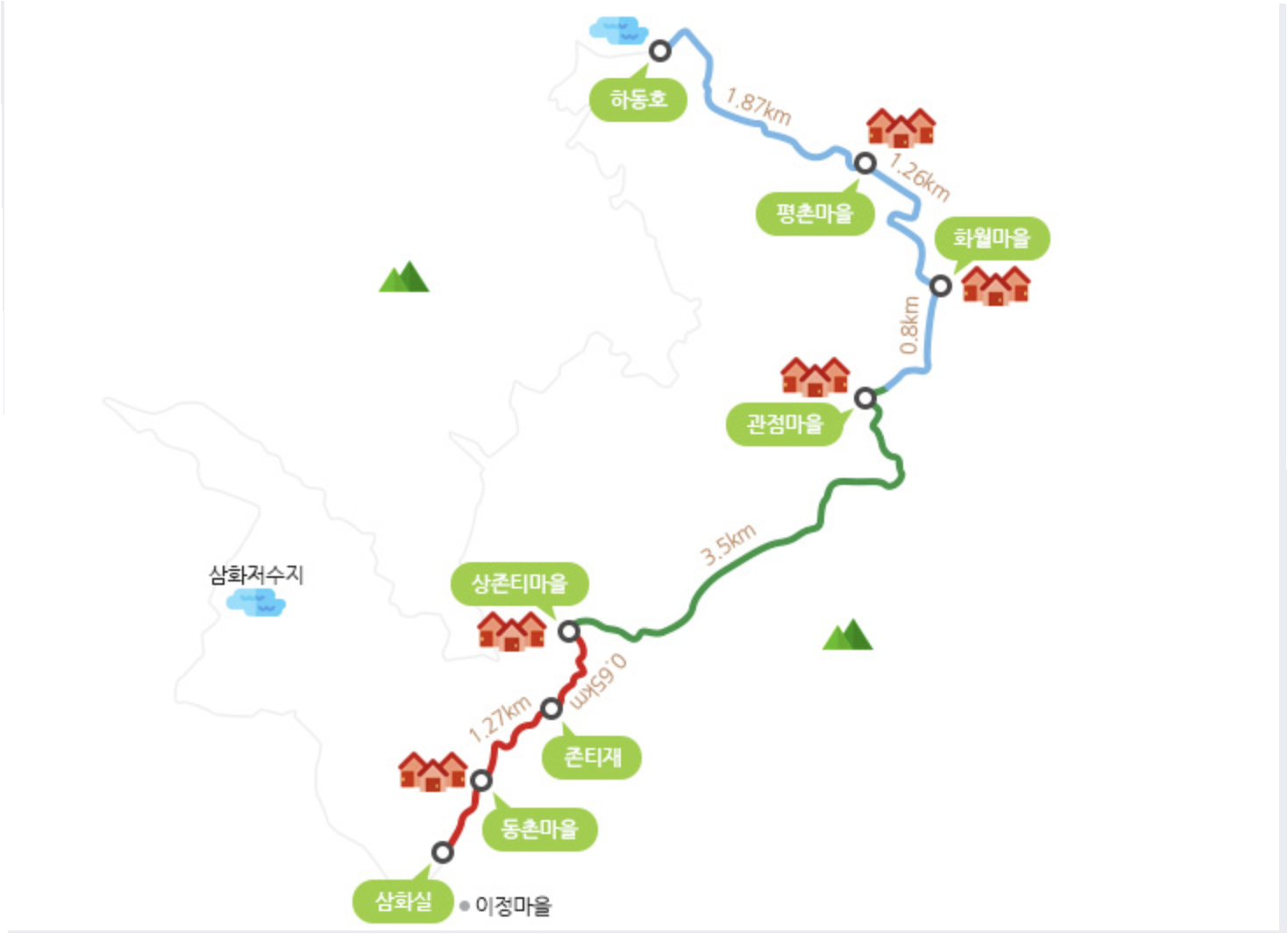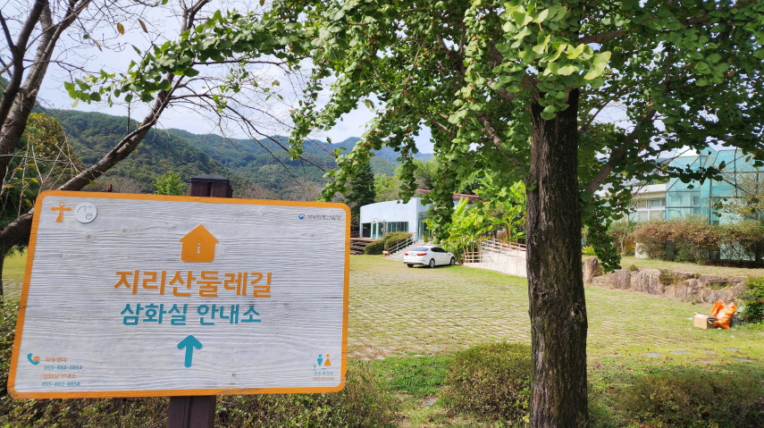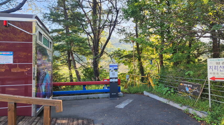 - 하동호 주차장에 차를 세우고 하동호에서 삼화실 지리산둘레길 안내소까지 코스 길을 시작한다. (화장실 오른쪽으로 내려가는 길이 있다.)