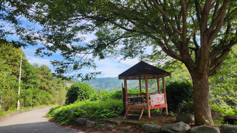- 코스 둘레길의 2/3 지점, 명사 돌배마을 쉼터에서 잠시 쉰다. 이제 고개만 넘어가면 된다.