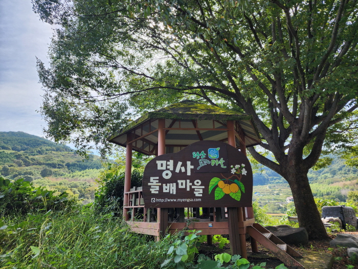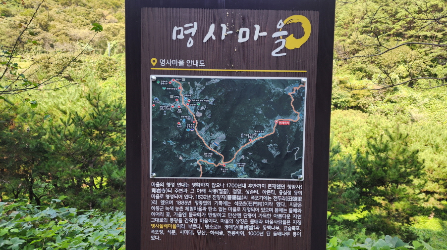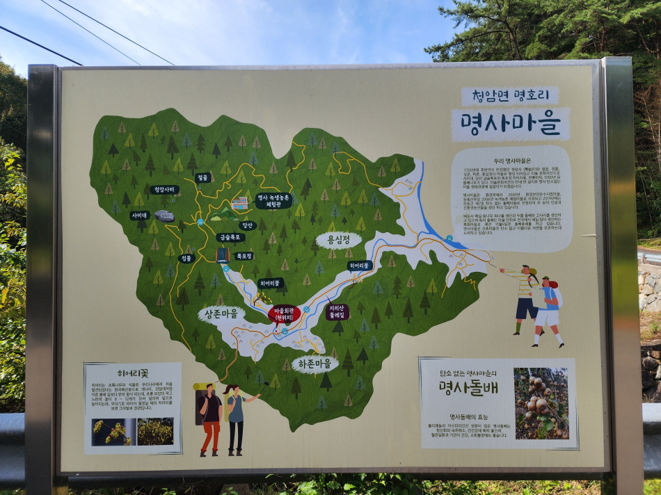 - 명사마을은 ('밝을 명'에 '절 사'를 쓴다. 1700년대 후반까지 존재했던 '청암사'라는 절이 있던 것에서 유래한 모양이다. 명사마을은 '하동군 녹색농촌 체험마을과 탄소없는 마을'로 지정되어 있다고 한다. 봄에는 하얀 돌배꽃과 히어리꽃, 가을에는 들국화가 만발하고, 오색의 단풍으로 아름다운 마을이다. 글슬폭포, 사미대, 석문, 하씨굴, 천룡바위, 1000년된 돌배나무등 볼거리가 많은 마을이기도 하다.