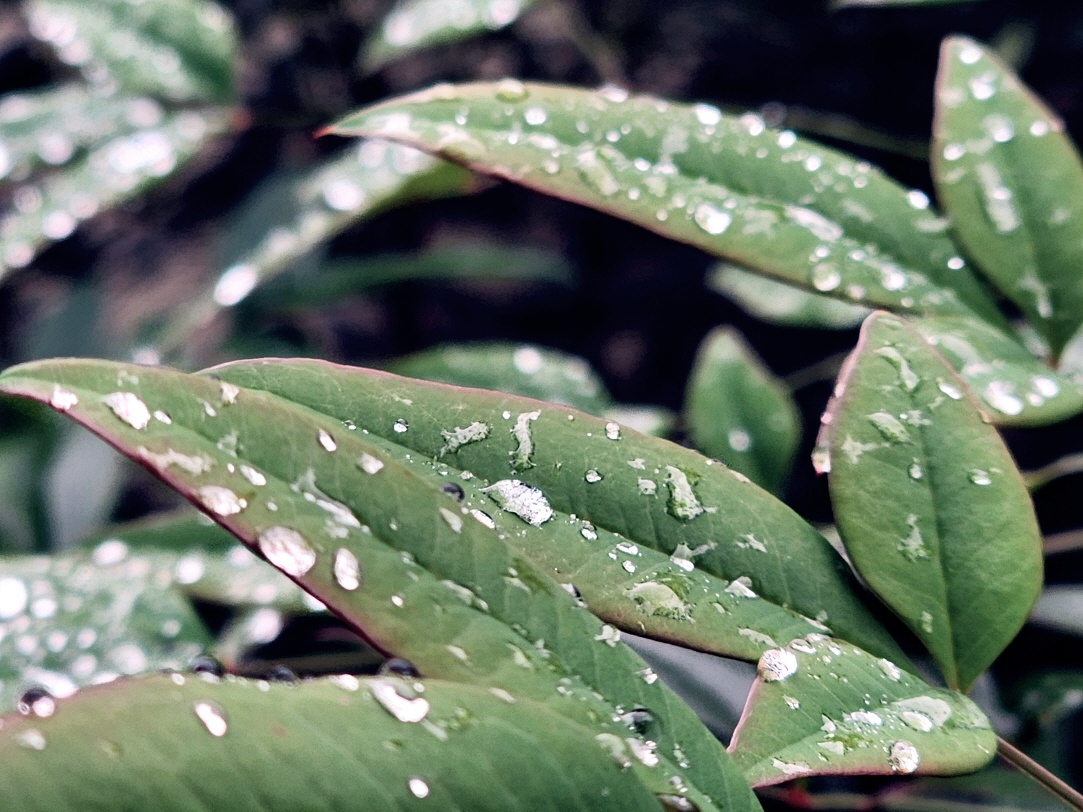 - 어제 내린 비로 맺힌 물방울이 아직 마르지 않고 매달려 있다.