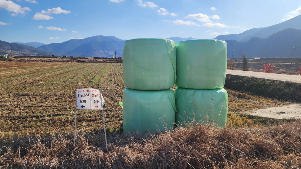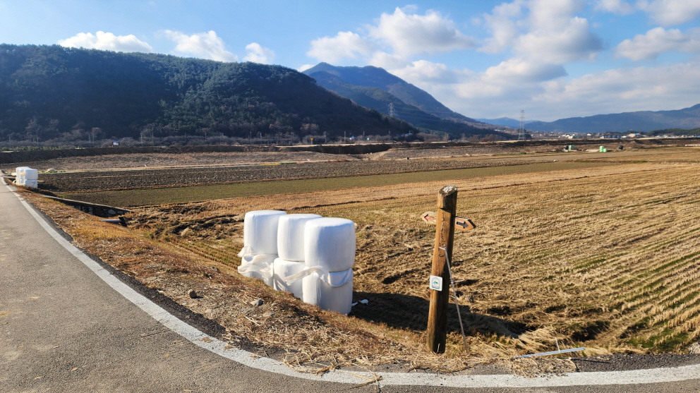 - 바람이 너무도 많이 불어, 모자가 날아갈 뻔 한다. 쌓아놓은 볏집묶음의 비닐들이 머풀러 자락처럼 날린다.