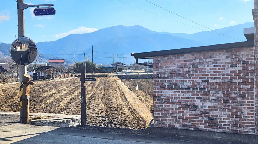 - 벅수가 가르키는 방향으로 마을 길을 따라 원내마을을 지난다.