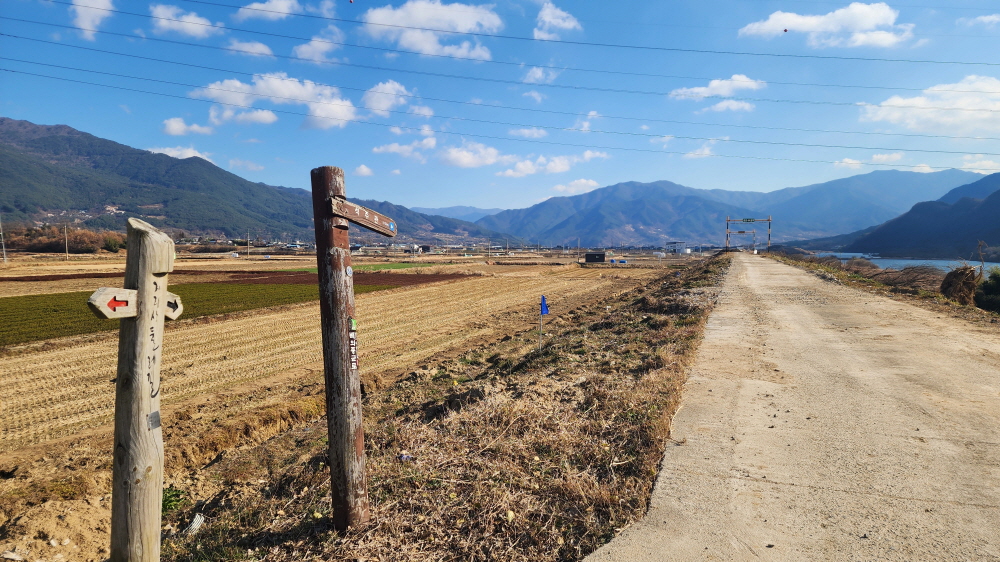 - 섬진강 둑방길을 따라 걷다, 논길, 마을 길을 지난다.