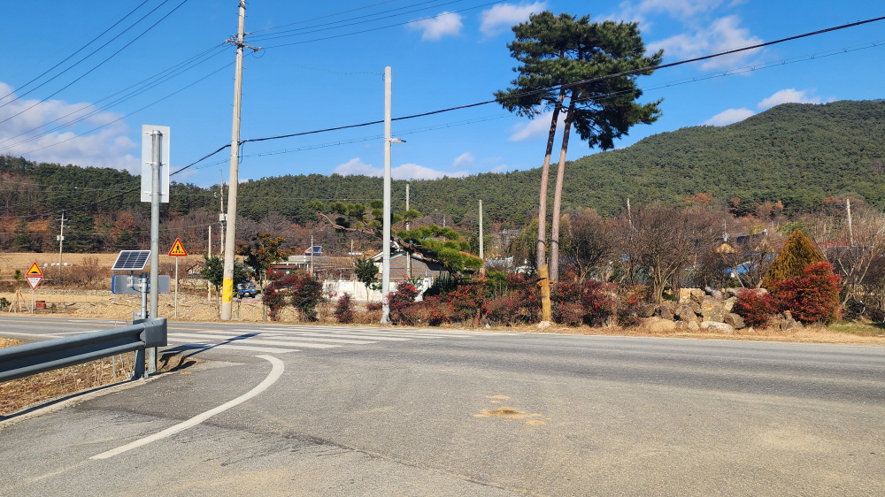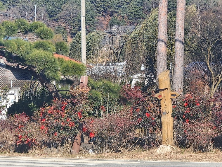 - 곡전재길에서 나와 횡단보도 앞에 있는 벅수, 잘 보이지 않는다. 아마도 용호정에서 운조루 방향으로 많이들 걷기 때문에 이 횡단보도 앞에 벅수를 논 모양이다. 아무튼 찻길을 따라 버스정류장을 지나 조금 걸어 굽어져야 한다.