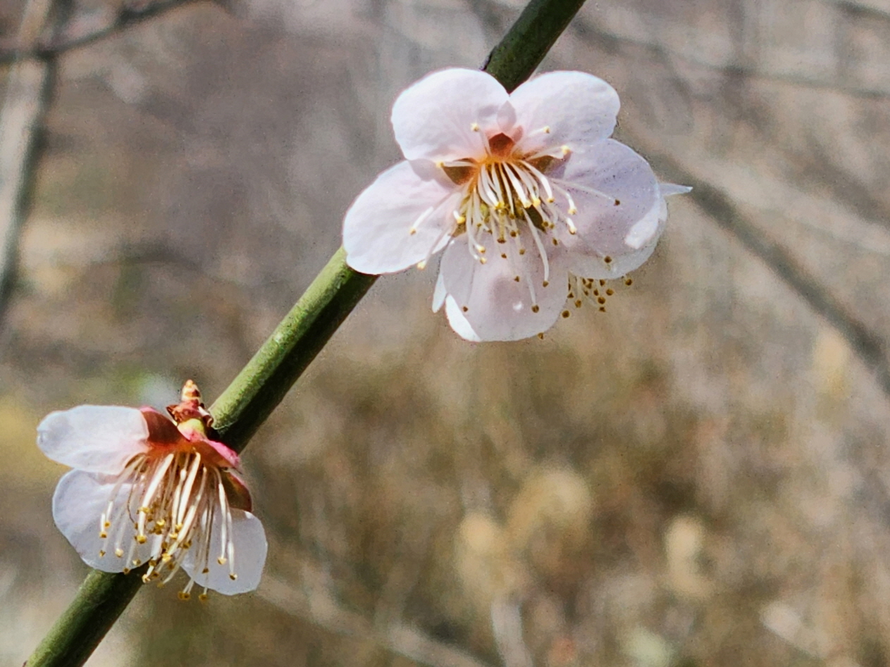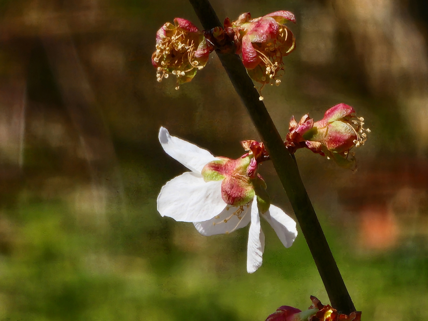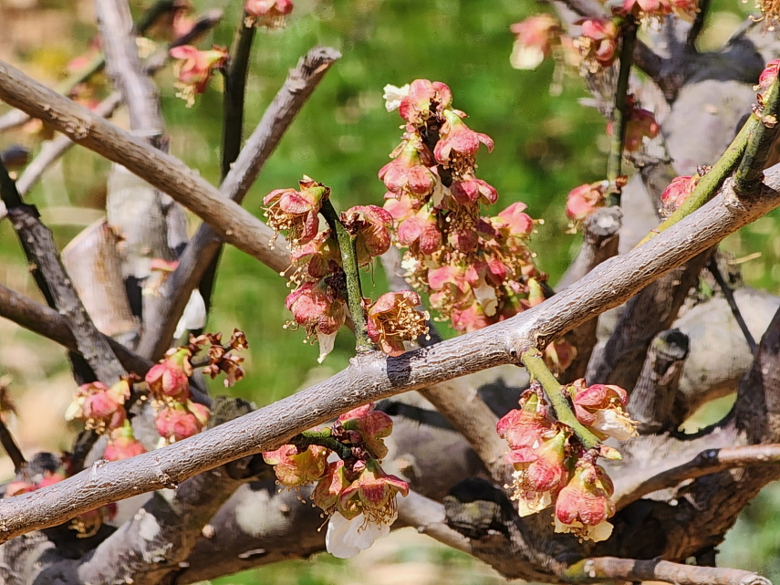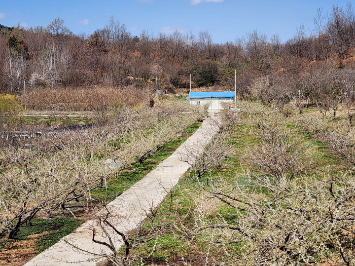 - 매실밭에 매화가 아직 남아 있다. 하얀 꽃잎이 떨어지고 붉은 꽃받침만 남은 것들도 많고,