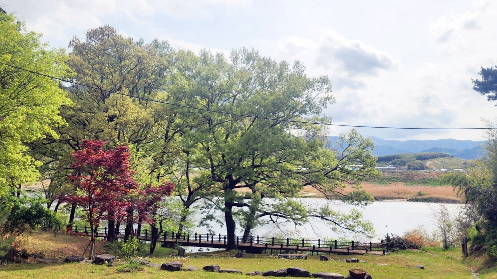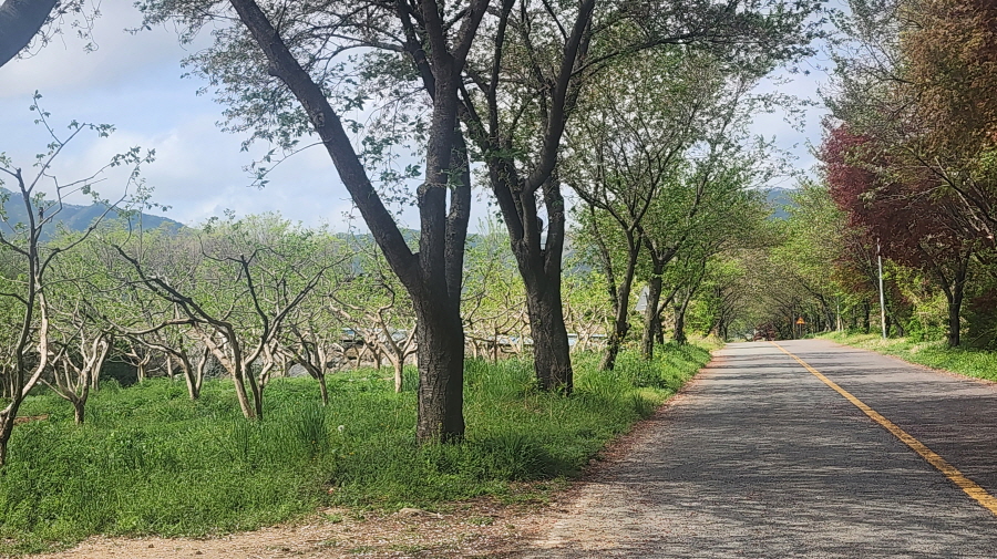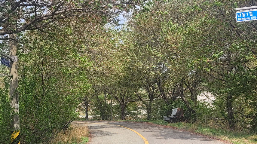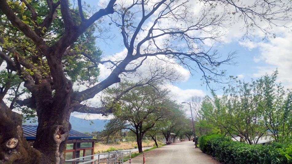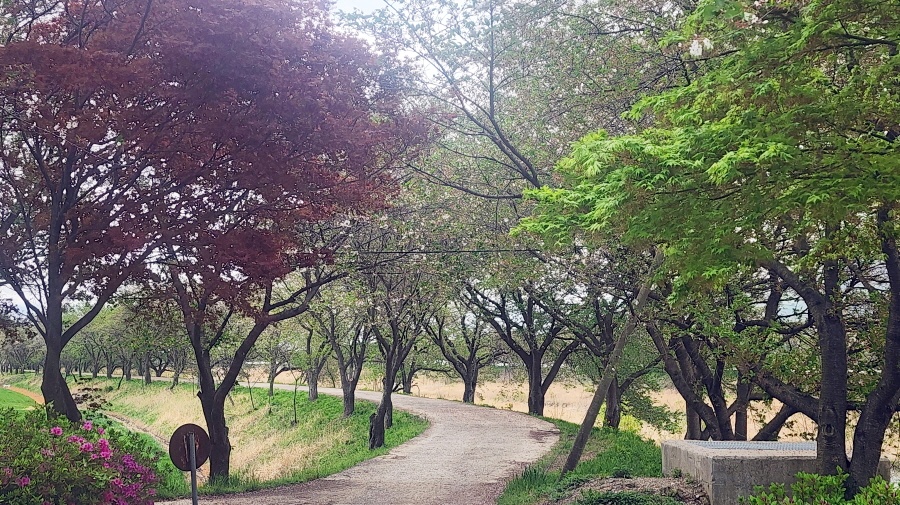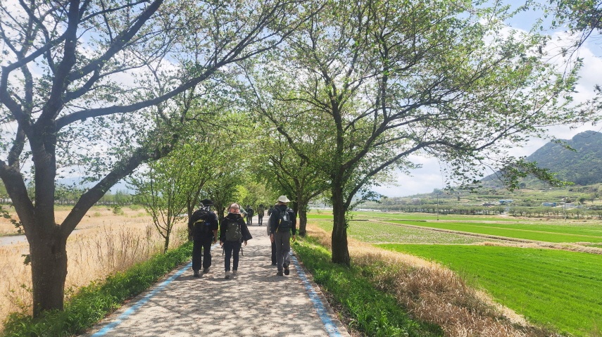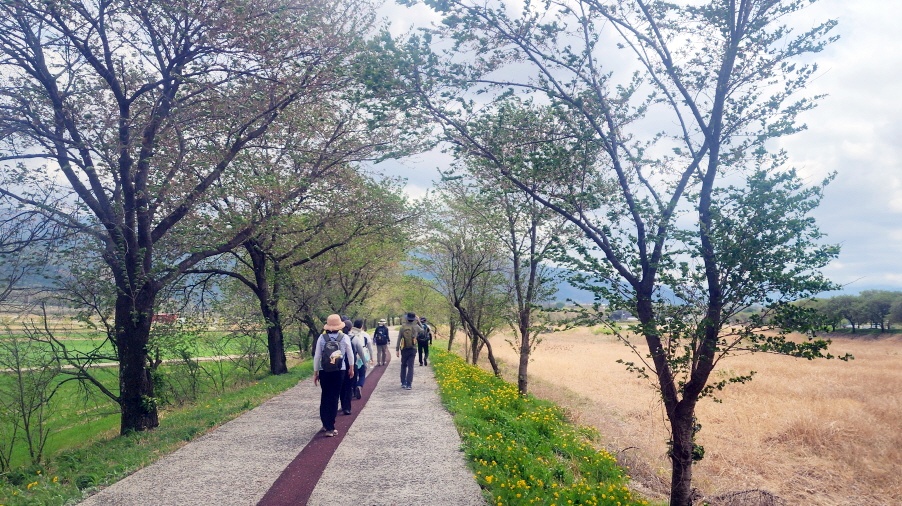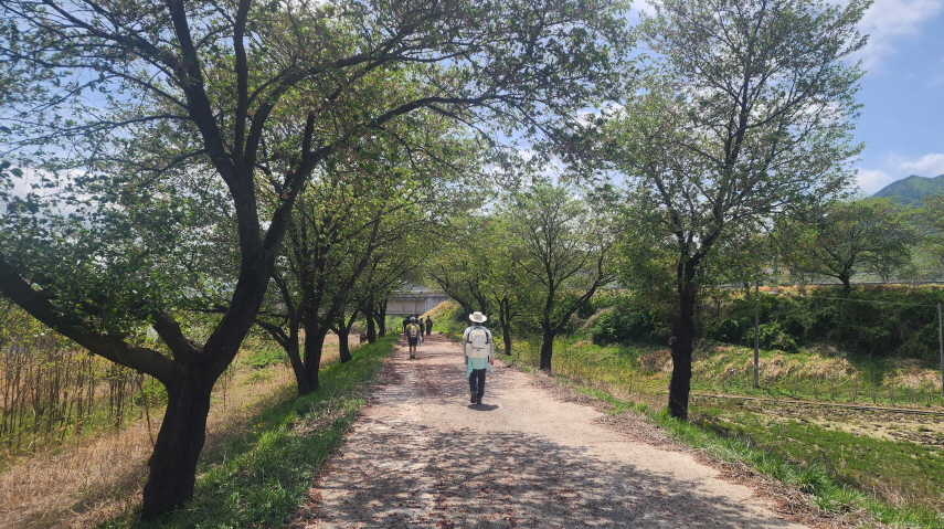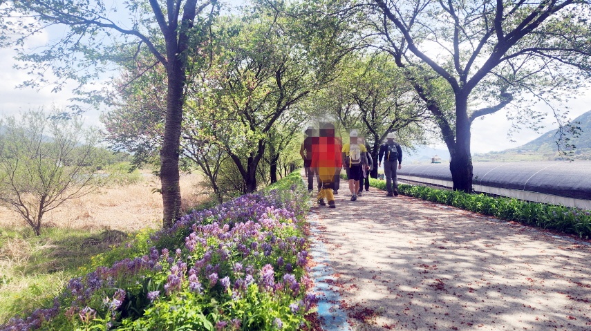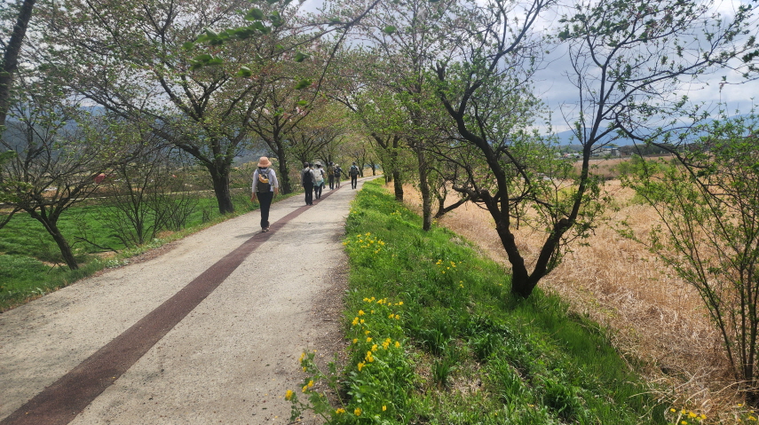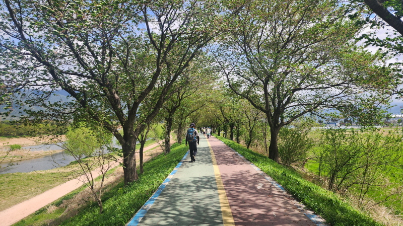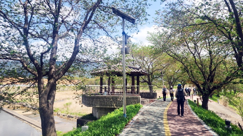 - 오미- 난동 구간은 섬진강변과 서시천을 따라 걷는 길이라 양쪽으로 벚나무가 우거져 3월 말에서 4월초가 가장 아름다운 길이다. 지금은 벚꽃이 지고, 붉은 꽃술과 연한 잎들로 푸르러져 있는 시기라 꽃은 볼 수 없지만, 싱그러운 연초록의 구례를 감상하기 좋은 날이었다.