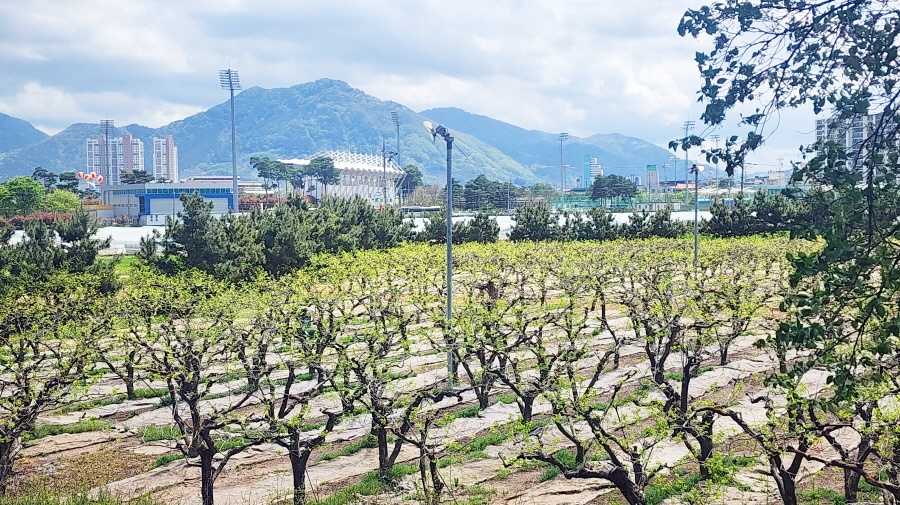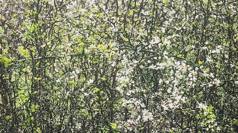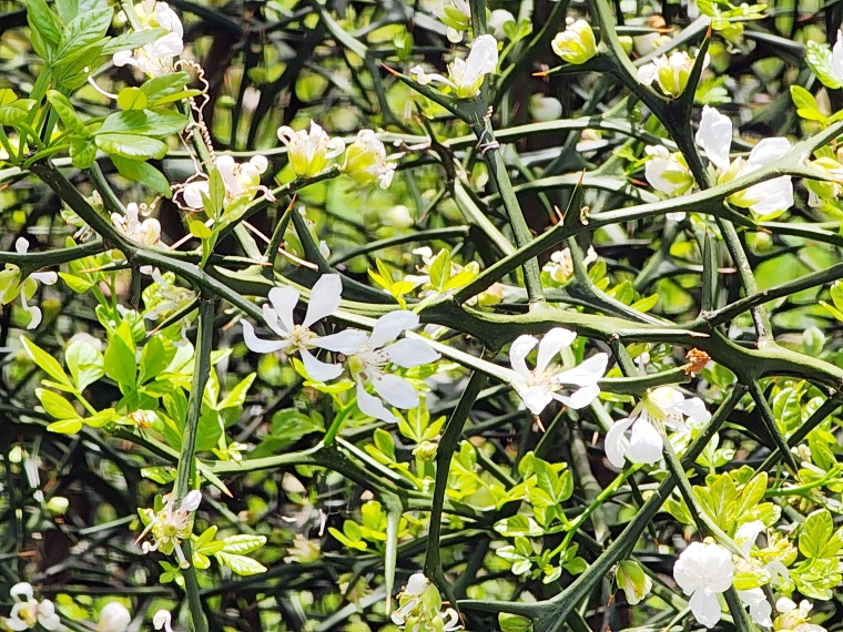 - 탱자나무 울타리에 핀 꽃과 밭에 심어진 나무에 핀 흰꽃