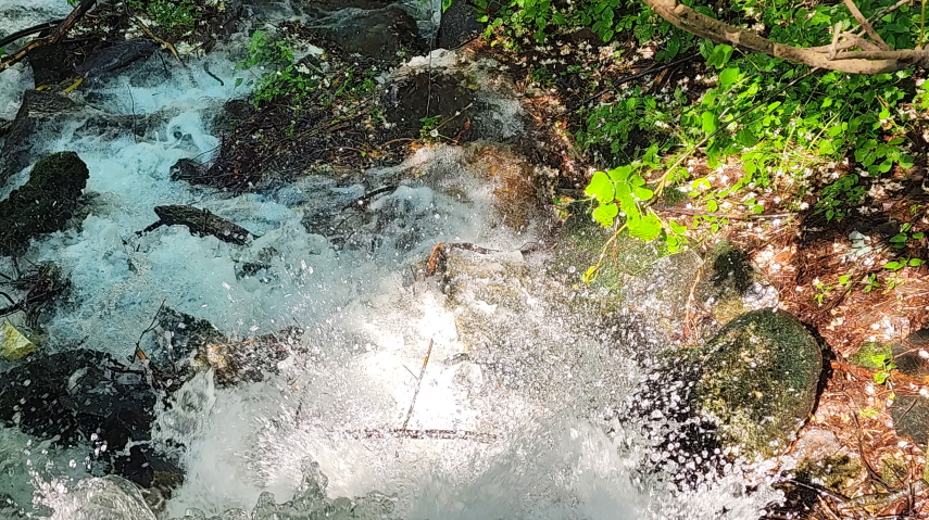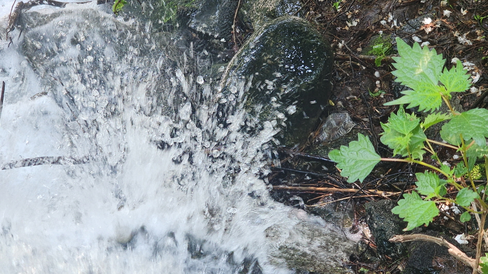 - 떨어지는 물이 물방울을 뛰기며 튀어 오른다.