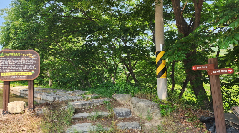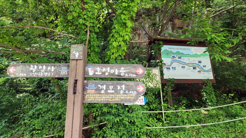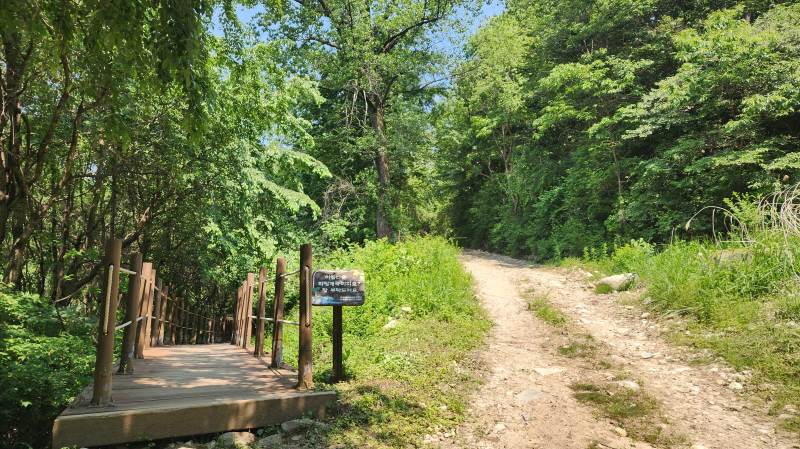 - 숲길을 걷다 이 다리가 보이는 곳에서 왼쪽 숲길로 들어선다. 경모정 호성마을 방향, 다리를 건너면 안된다.^^