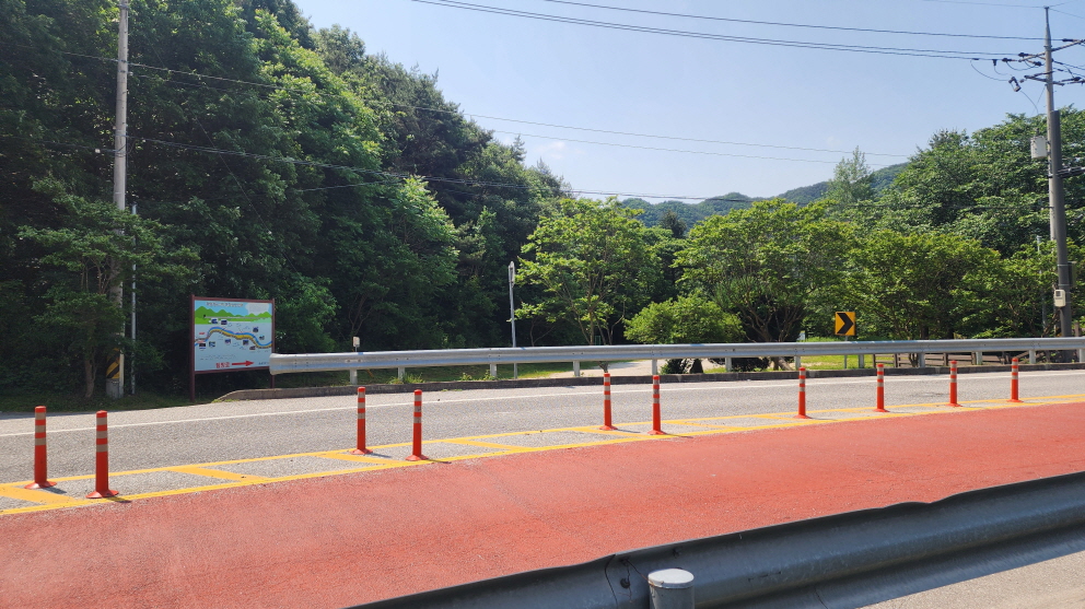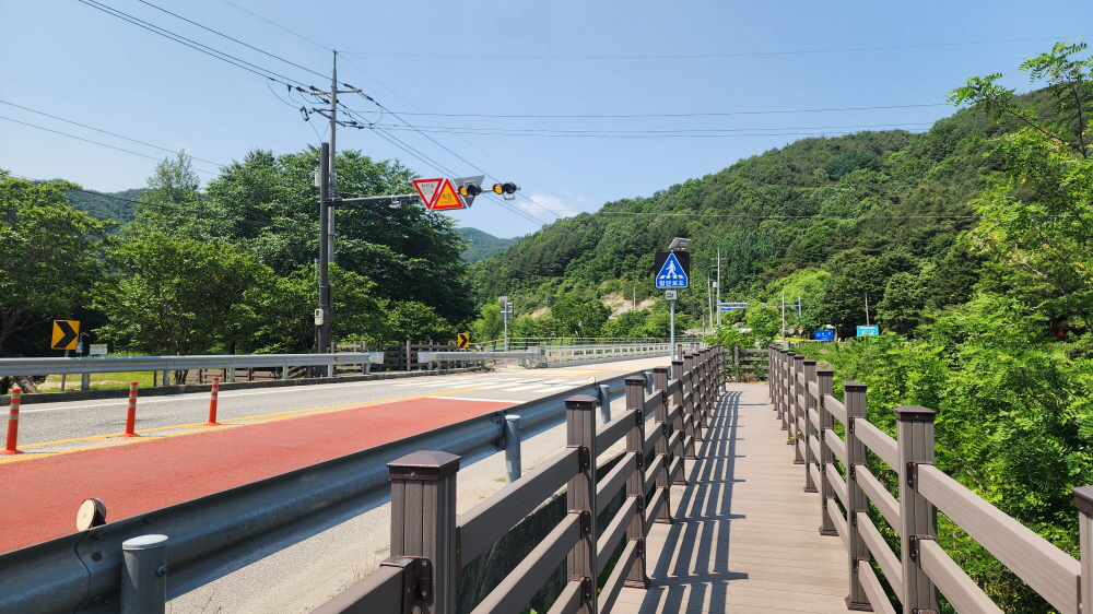 - 찻길을 따라 조금 걸으면 차가 많이 다니는 큰 도로와 만나고, 데크끝의 횡단보도를 건너, 안내판이 있는 곳으로 건너간다.