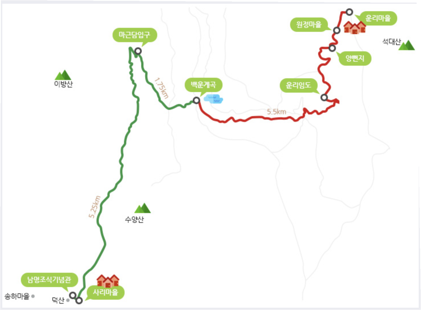 - 8구간 : 운리마을 -> 원정마을 -> 임로 -> 참나무 숲길 -> 백운계곡 -> 마근담 입구 -> 마근담 계곡 -> 남명기념관(사리마을)